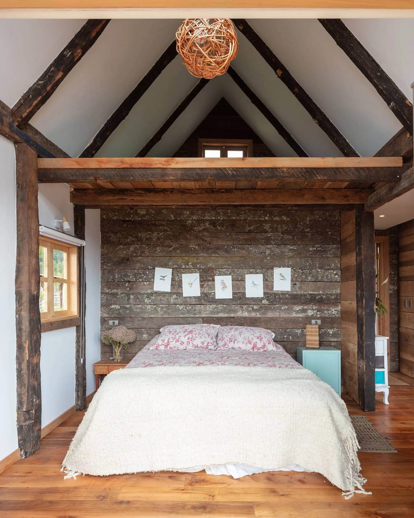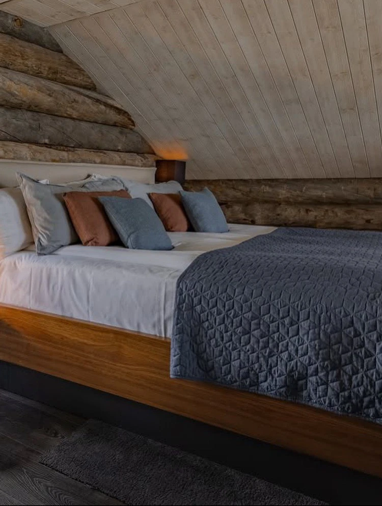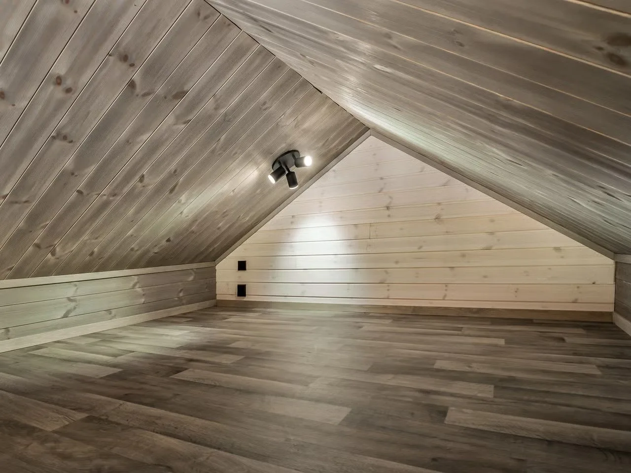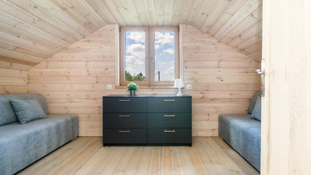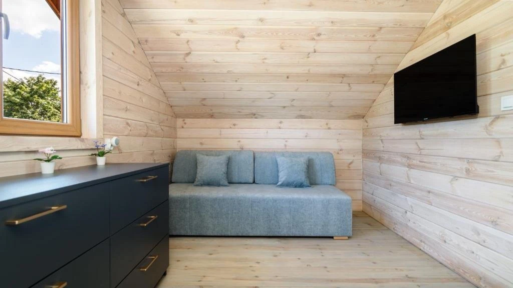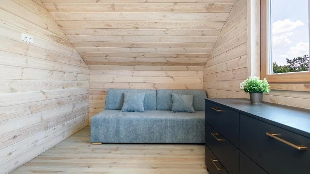 Лесной домик площадью 30м2 с натуральным фасадом из нестроганой доски и деревянным интерьером с открытыми балками.