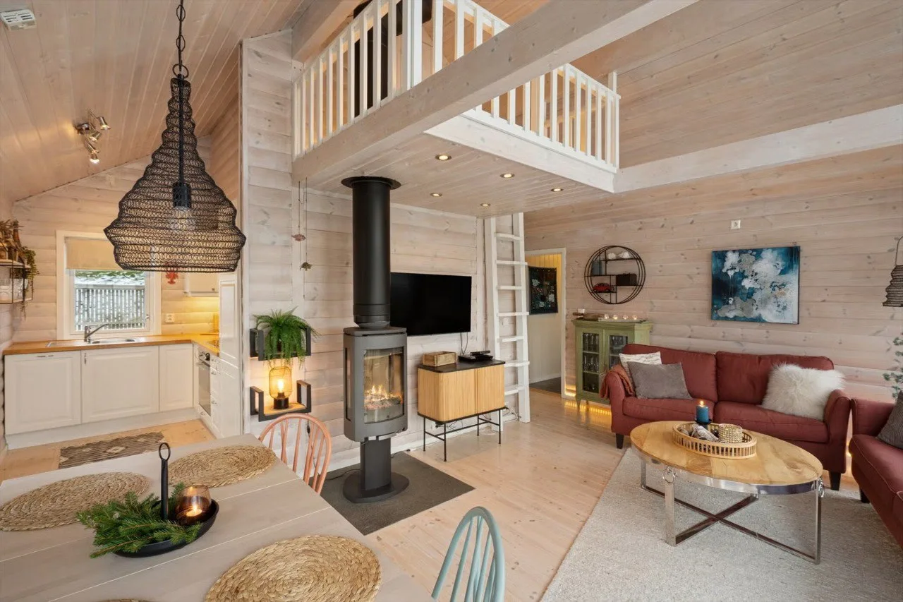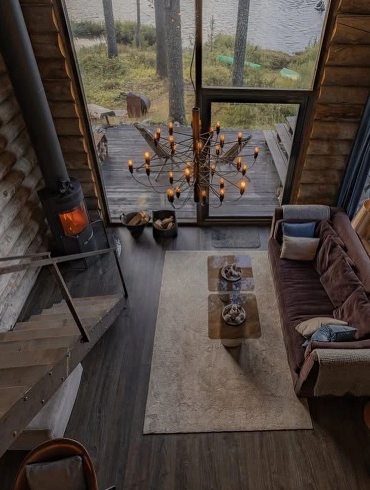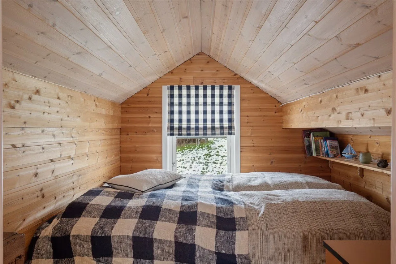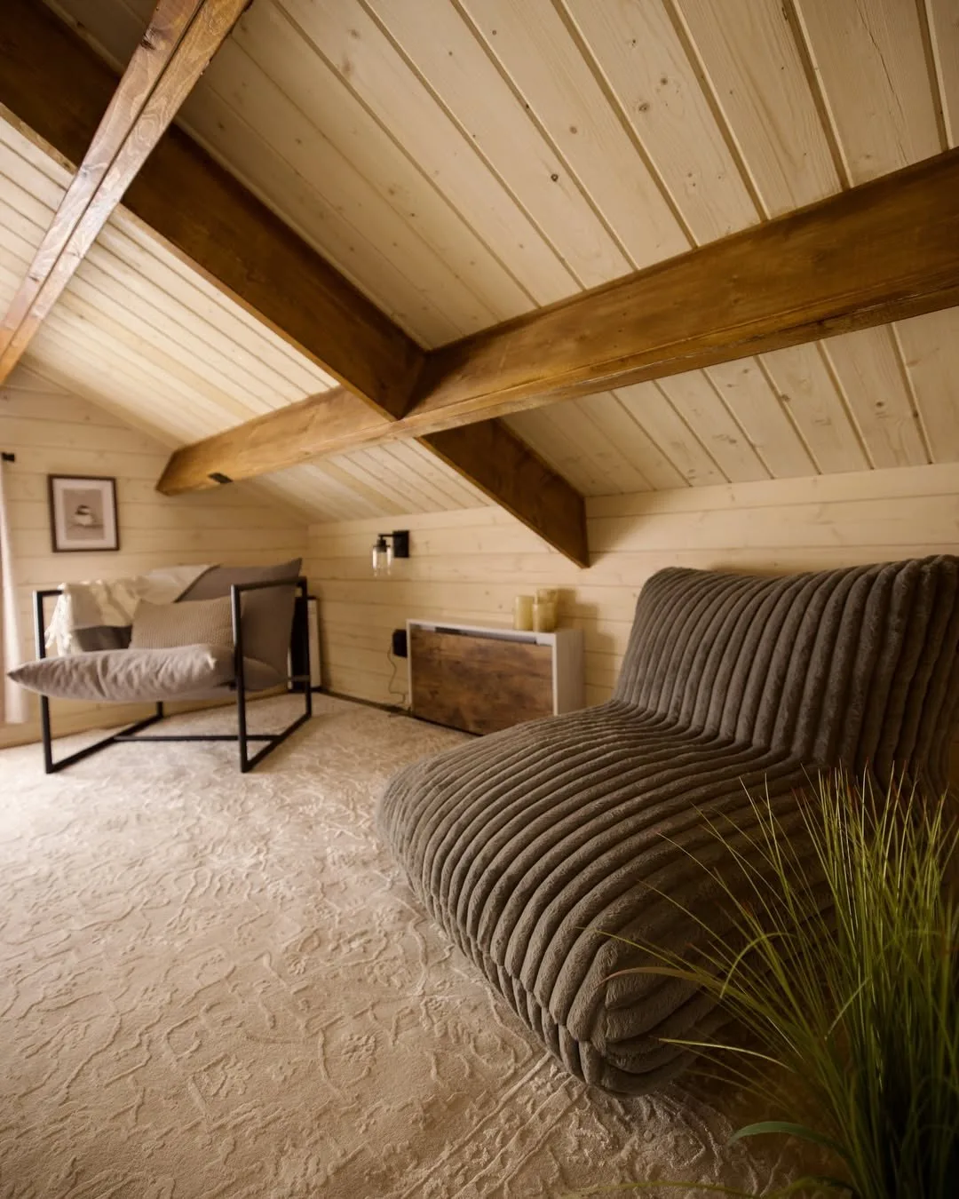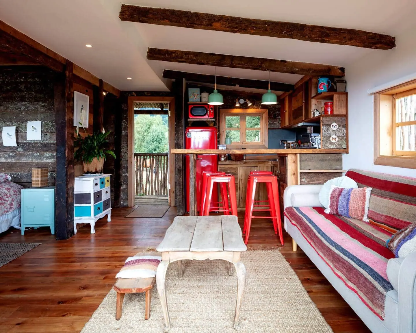 Лесной домик площадью 30м2 с натуральным фасадом из нестроганой доски и деревянным интерьером с открытыми балками.