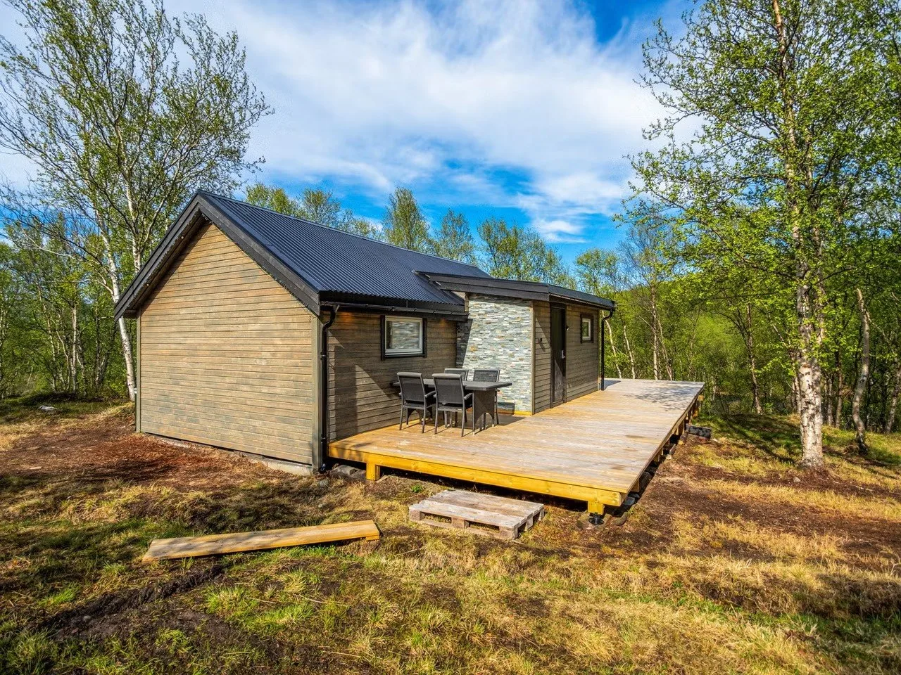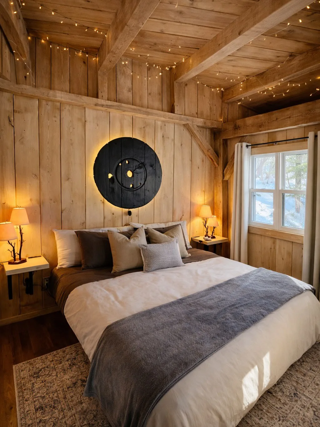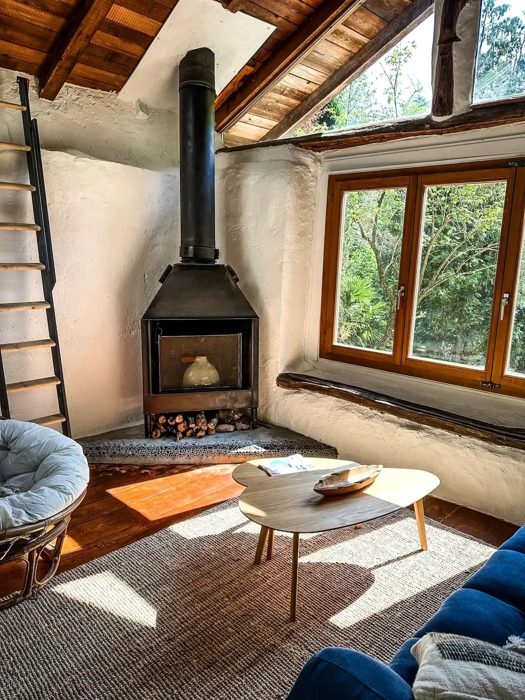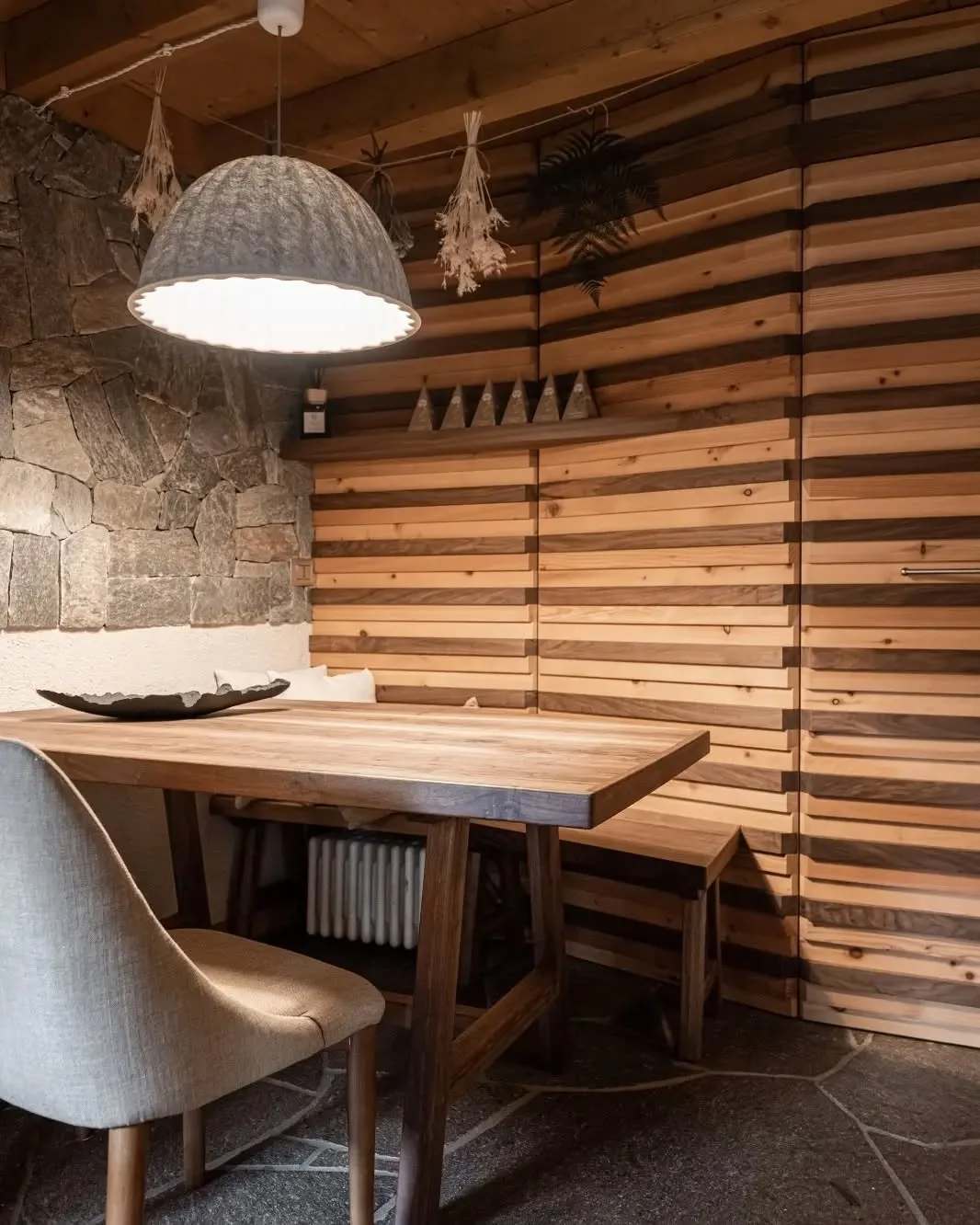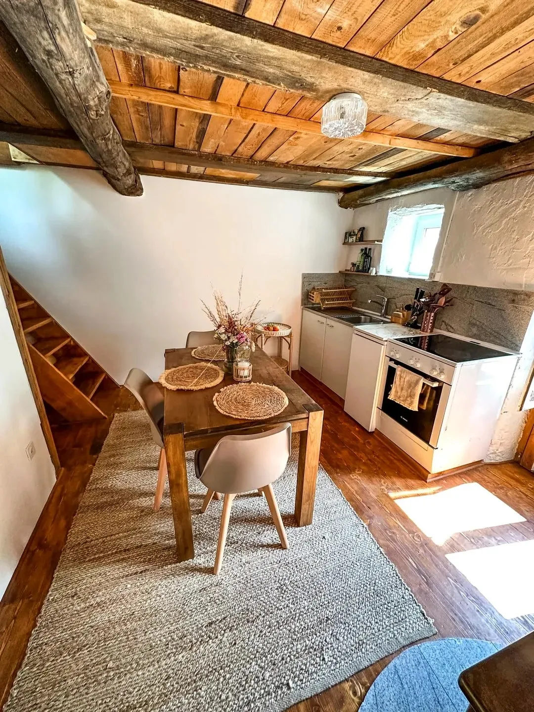 Лесной домик площадью 30м2 с натуральным фасадом из нестроганой доски и деревянным интерьером с открытыми балками.