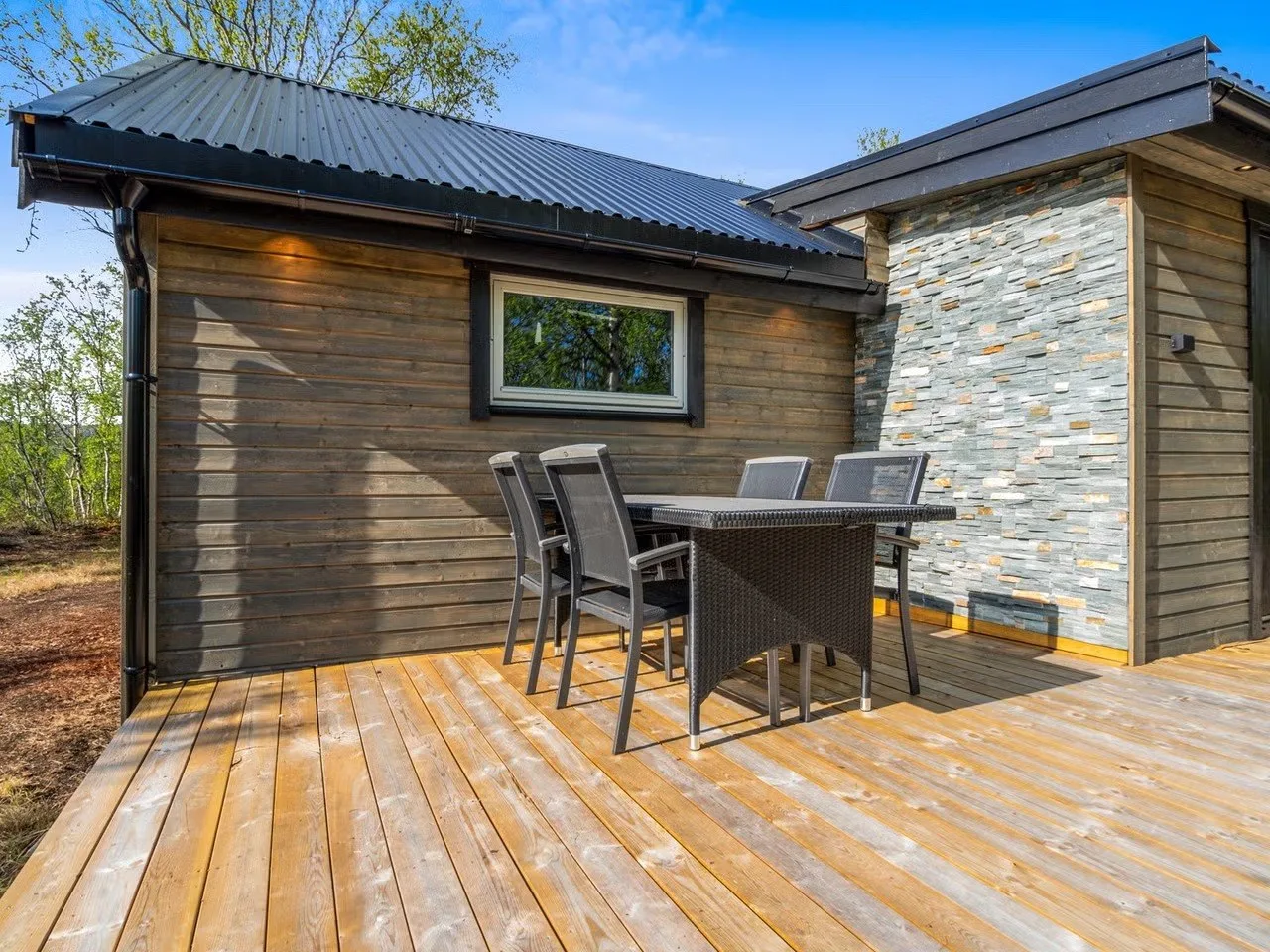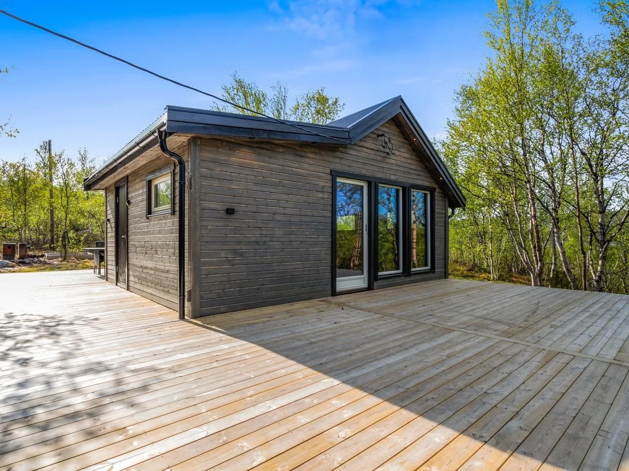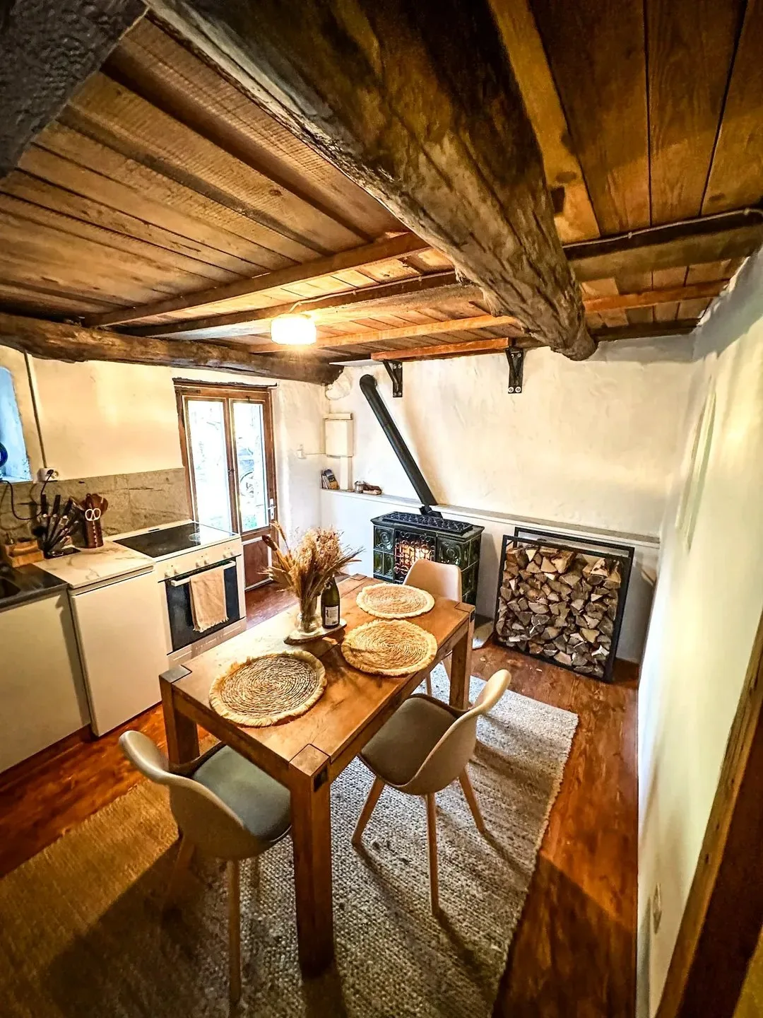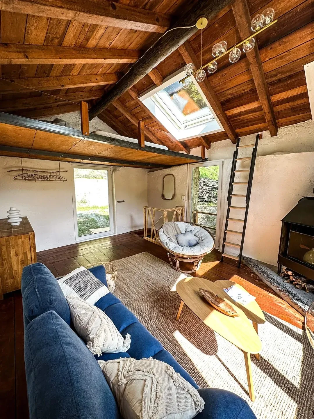 Лесной домик площадью 30м2 с натуральным фасадом из нестроганой доски и деревянным интерьером с открытыми балками.