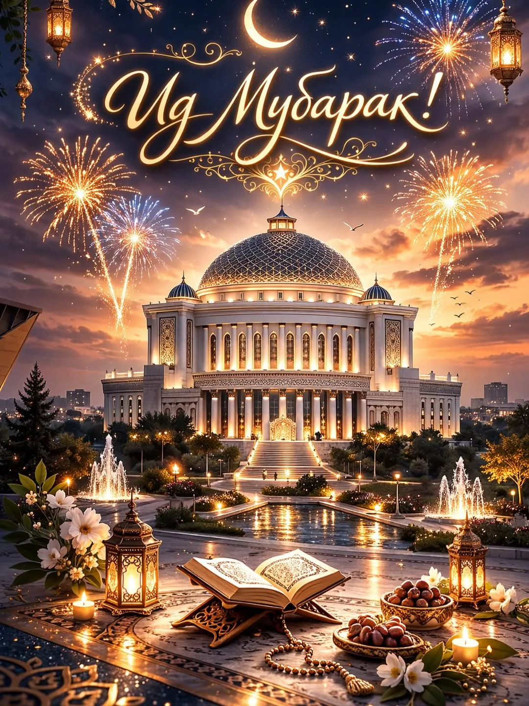 Этот благословенный день символизирует завершение священного месяца Рамадан — времени духовного очищения, добрых дел и искренней веры. Пусть «книга Рамадана» будет закрыта с принятием всех ваших молитв, постов и благих намерений, а её свет навсегда останется в ваших сердцах.