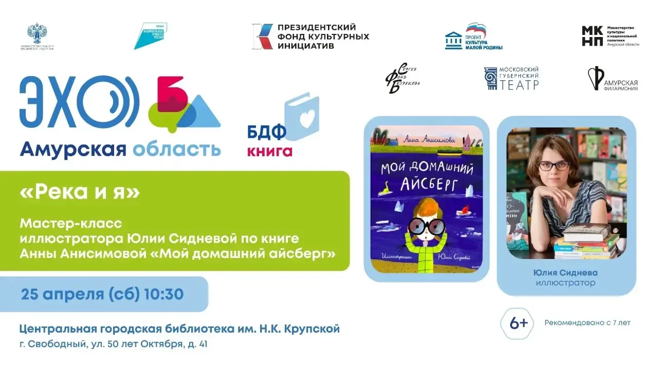 📍 10.30 Центральная городская библиотека им. Н.К. Крупской (Свободный) - «Река и я»: мастер-класс иллюстратора Юлии Сидневой по книге Анны Анисимовой «Мой домашний айсберг» (6+, рекомендовано с 7 лет)