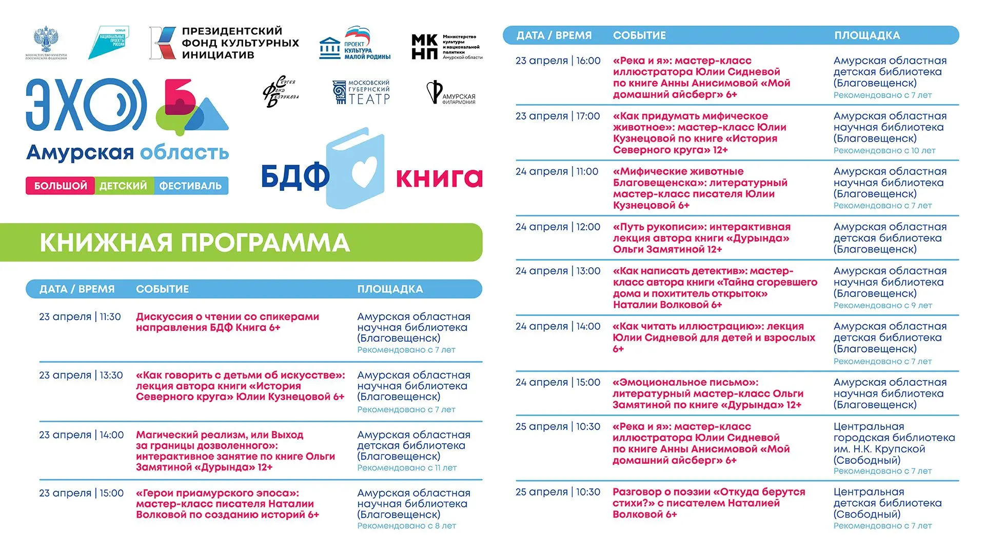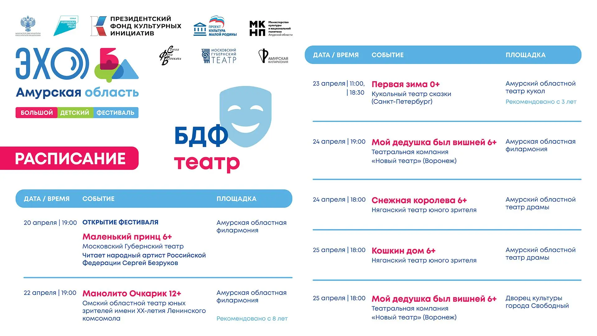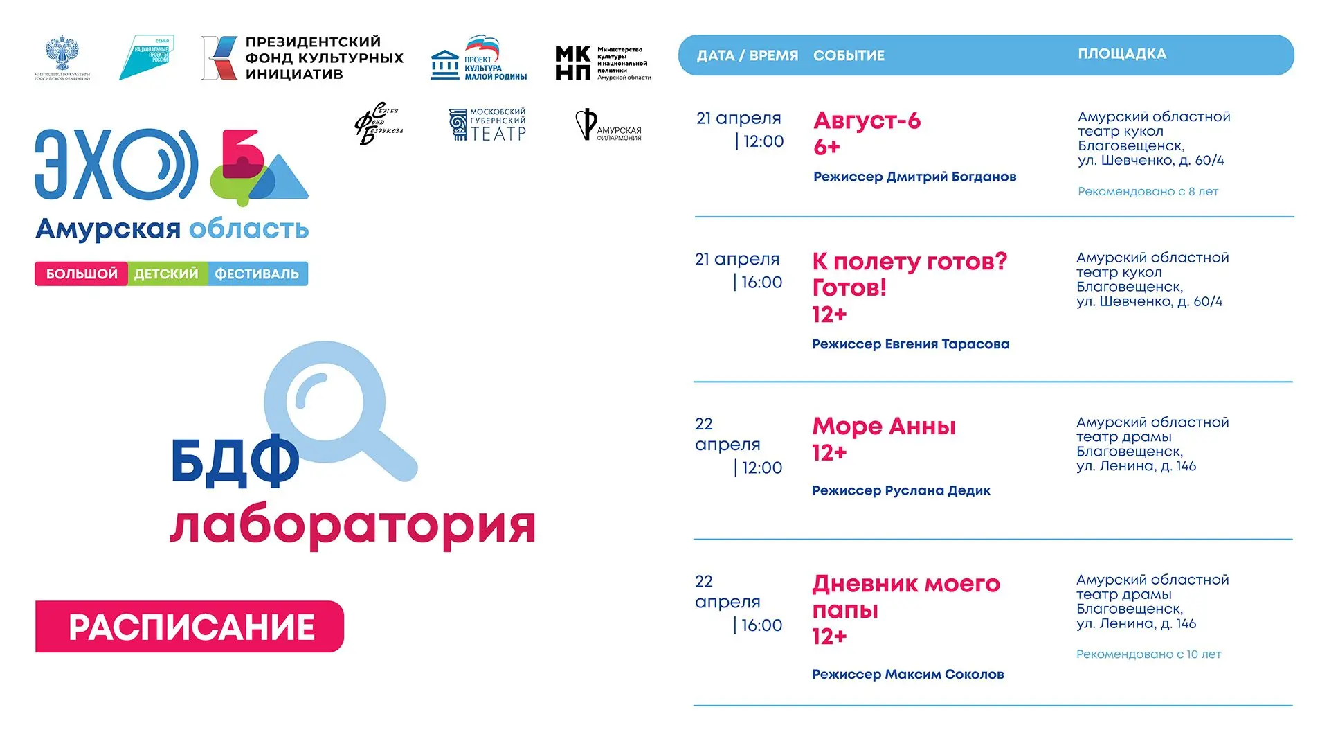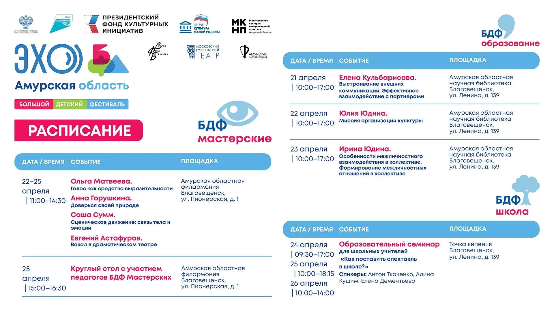 ✅️ Организаторы специального проекта «ЭХО БДФ Амурская область» — Фонд поддержки и развития социокультурных проектов Сергея Безрукова, Московский Губернский театр. Соорганизаторы — Министерство культуры и национальной политики Амурской области и Амурская областная филармония