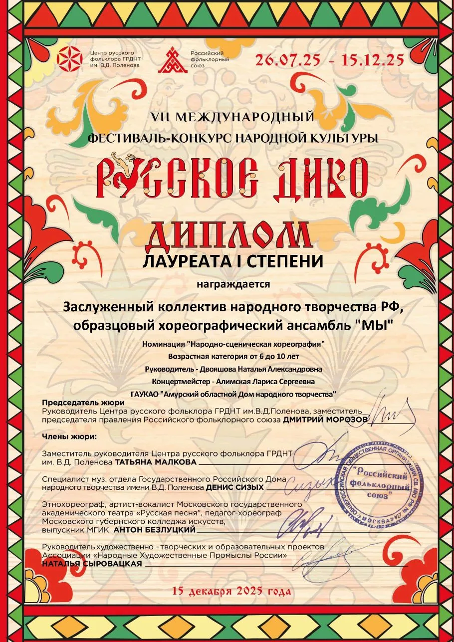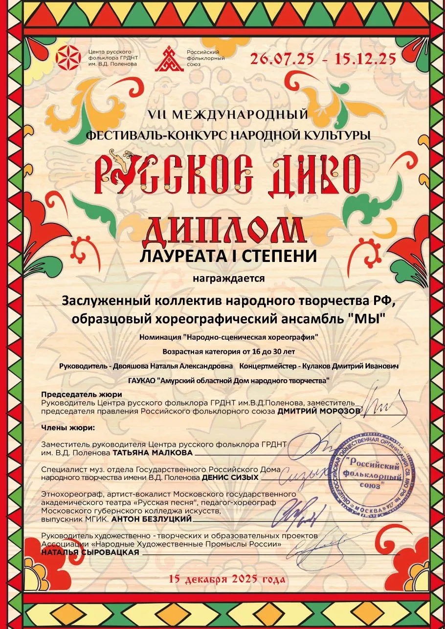 💥Сразу три диплома Лауреата I степени завоевал для Амурской области заслуженный коллектив народного творчества Российской Федерации, образцовый хореографический ансамбль «Мы» на VII Международном фестивале-конкурсе народной культуры «Русское Диво».