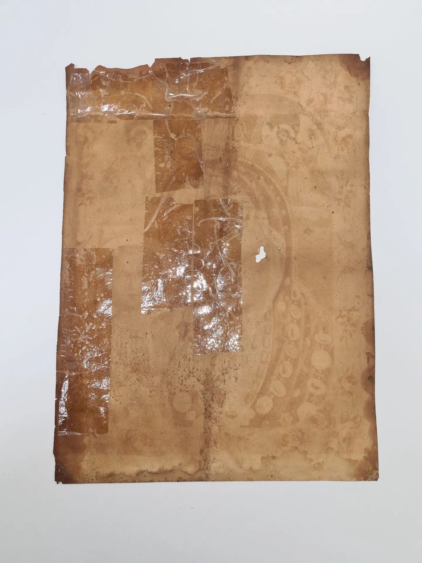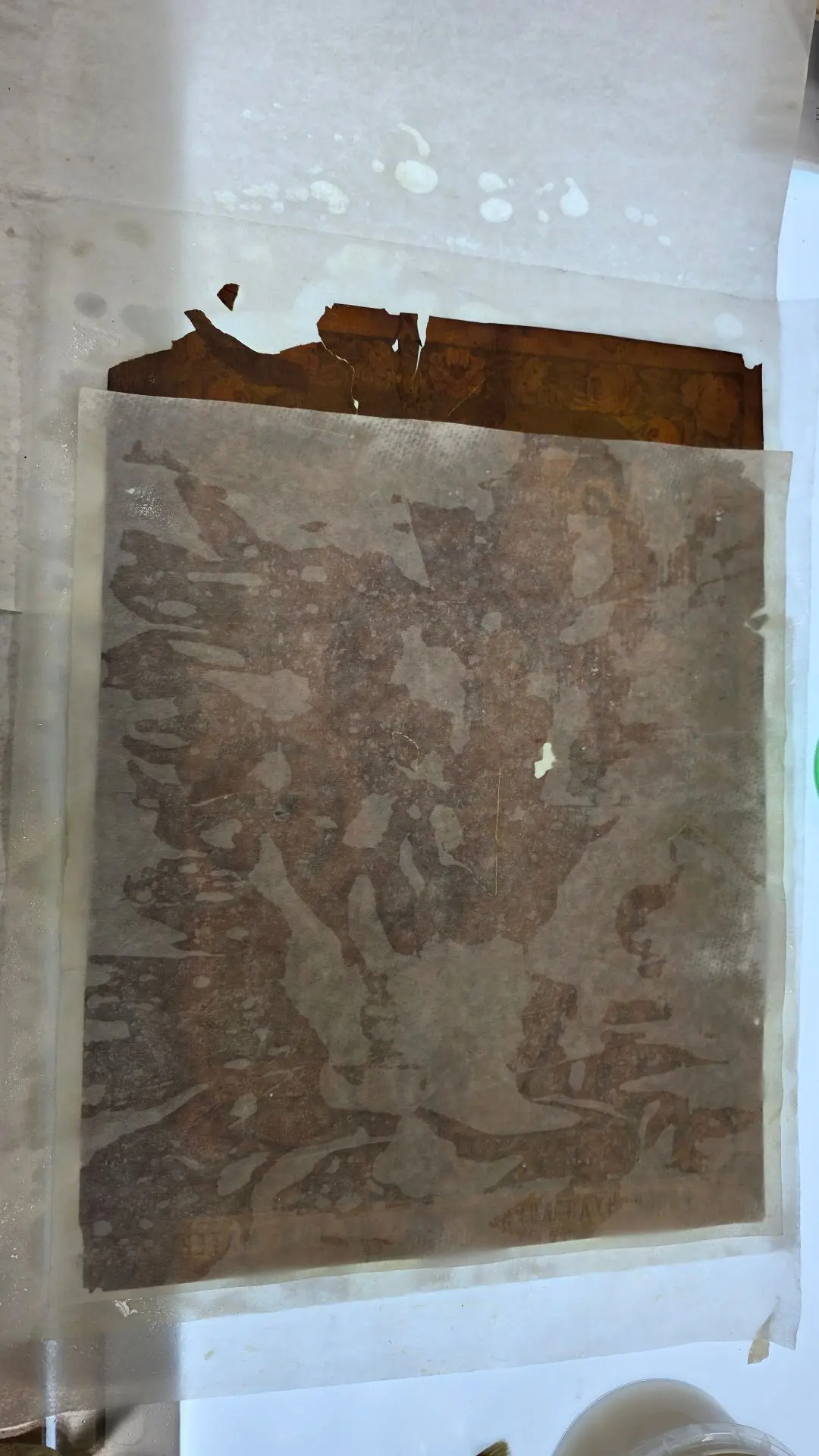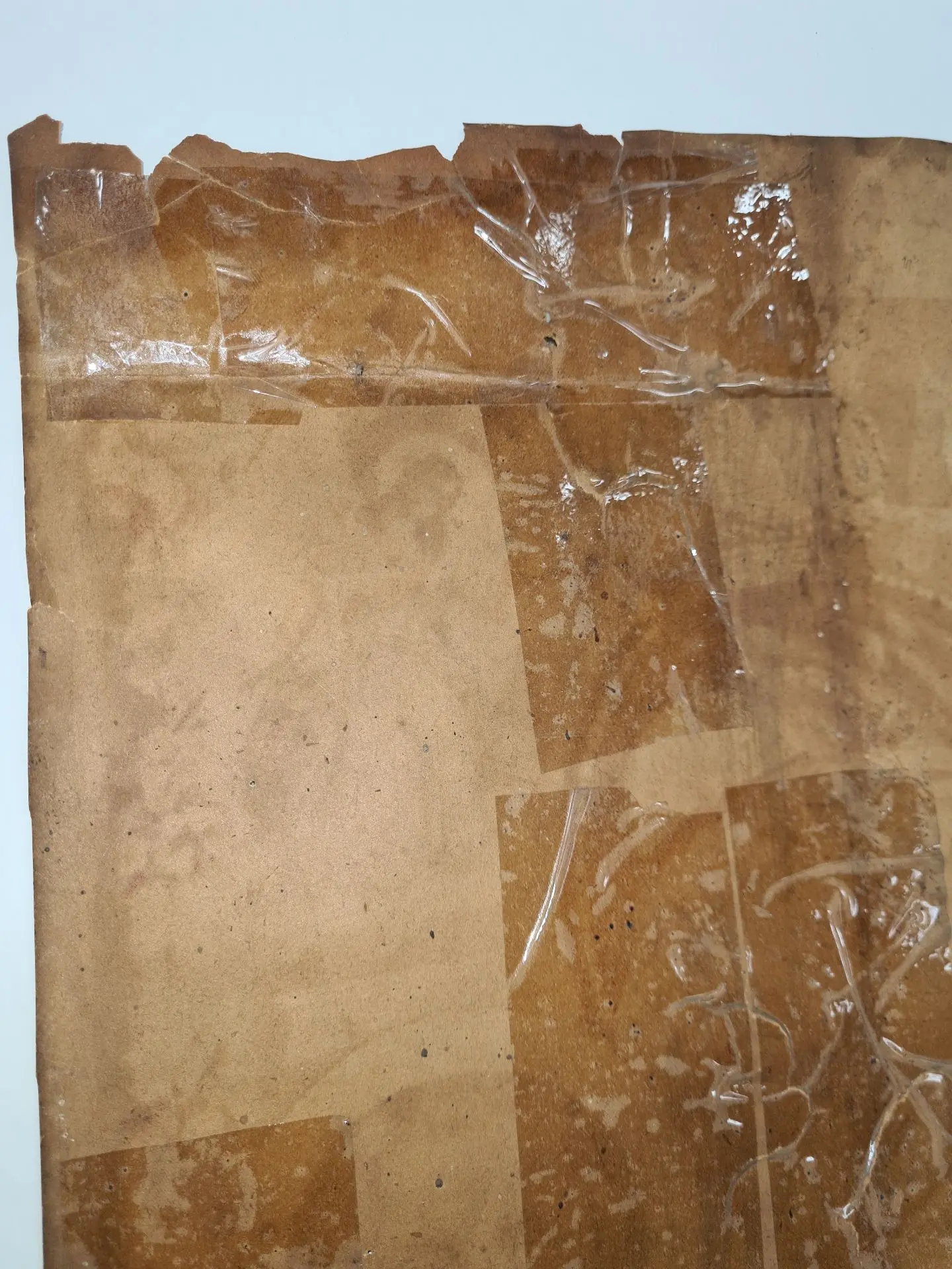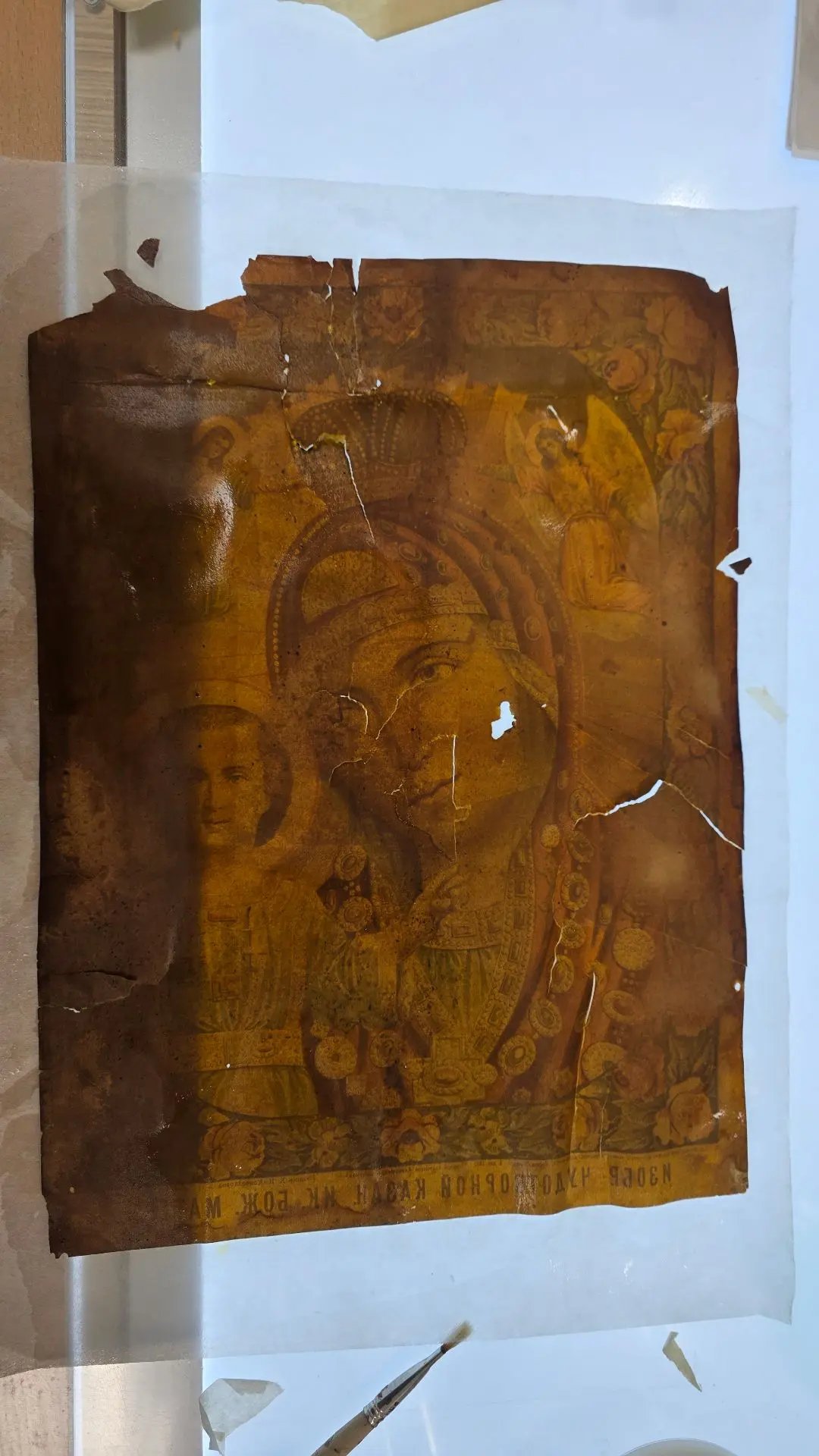 Икона за свое бытование покрылась копотью от лампад и свечей, разрывы были заклеены скотчем (а это враг злейший бумаги!), присутствовали утраты, ну и конечно, следы жизнедеятельности насекомых.