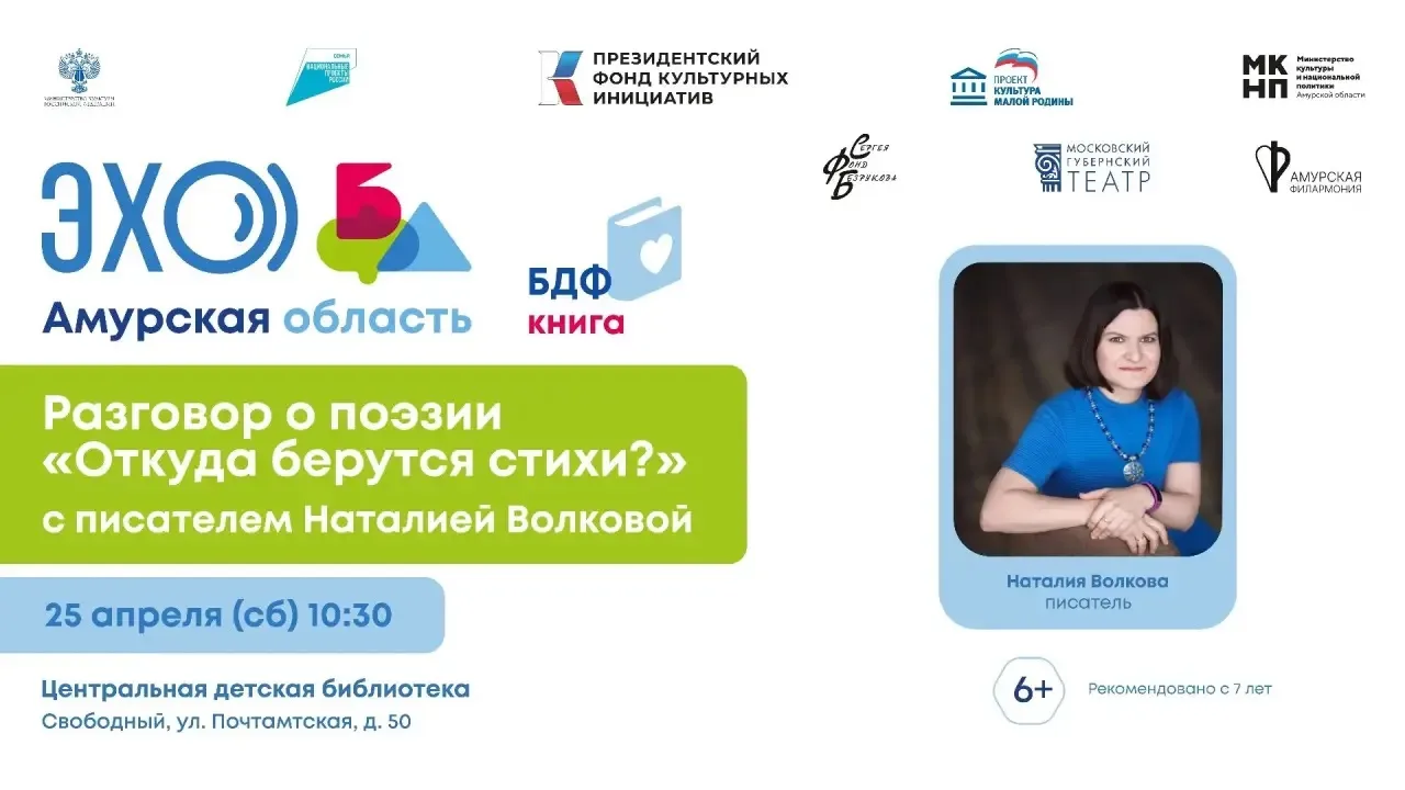 📍10.30 Центральная детская библиотека - Разговор о поэзии «Откуда берутся стихи?» с писателем Наталией Волковой (6+, рекомендовано с 7 лет)