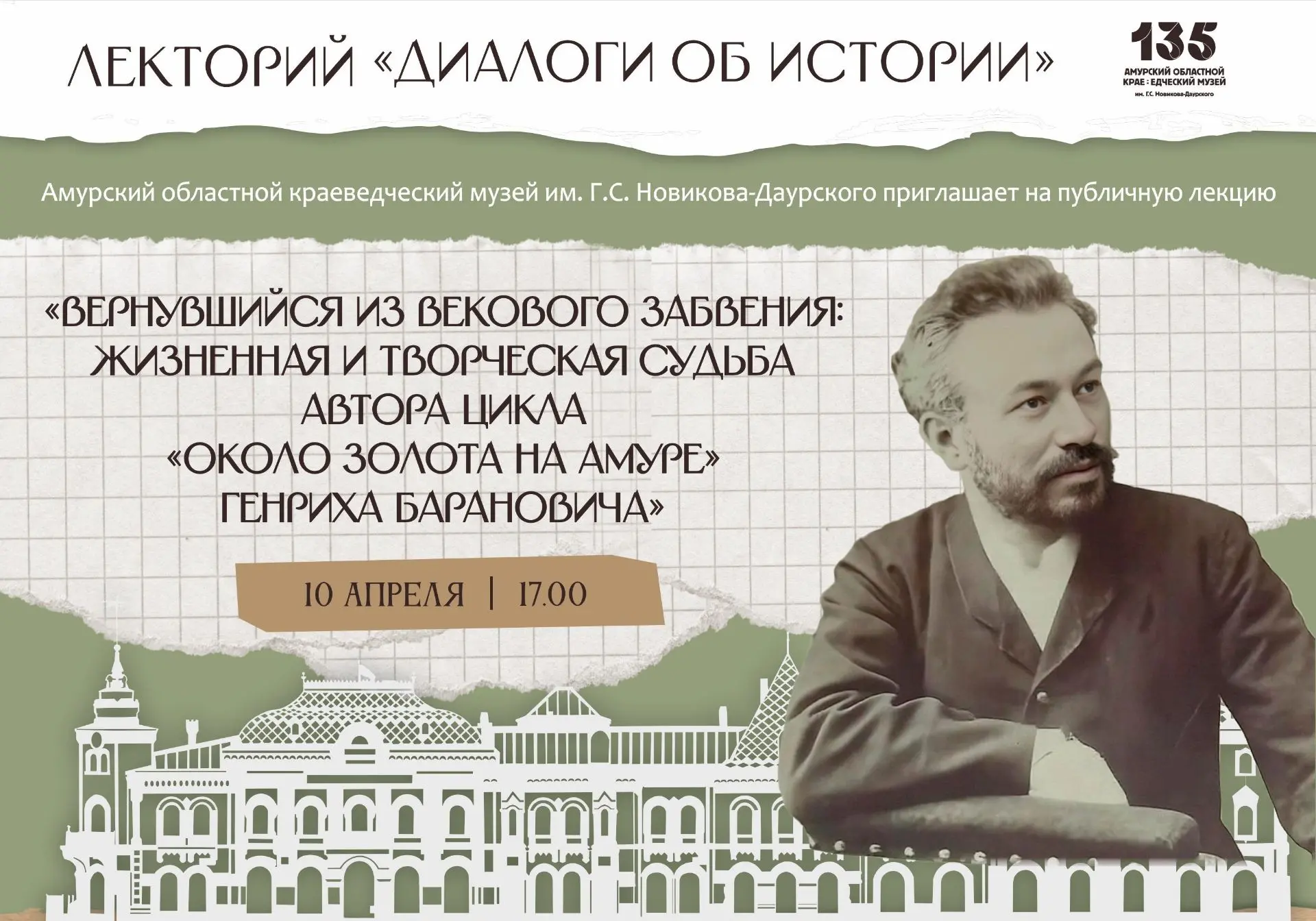 👨🏫Амурский областной краеведческий музей им. Г.С. Новикова-Даурского приглашает на публичную лекцию, посвящённую жизни и творчеству писателя Серебряного века Генриха Викентьевича Барановича — автора цикла «Около золота на Амуре».