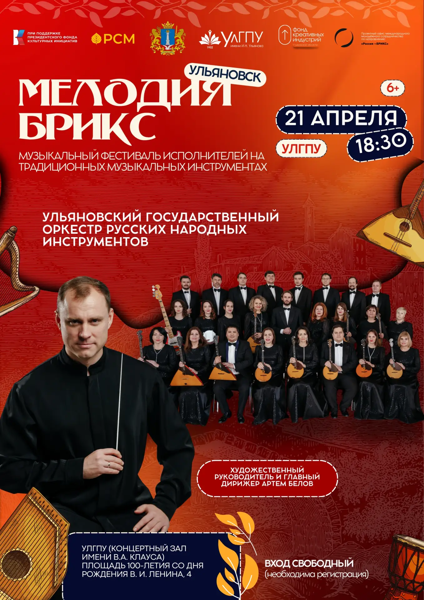 Ульяновский государственный оркестр русских народных инструментов под управлением художественного руководителя и главного дирижера Артёма Белова станет объединяющей основой вечера.