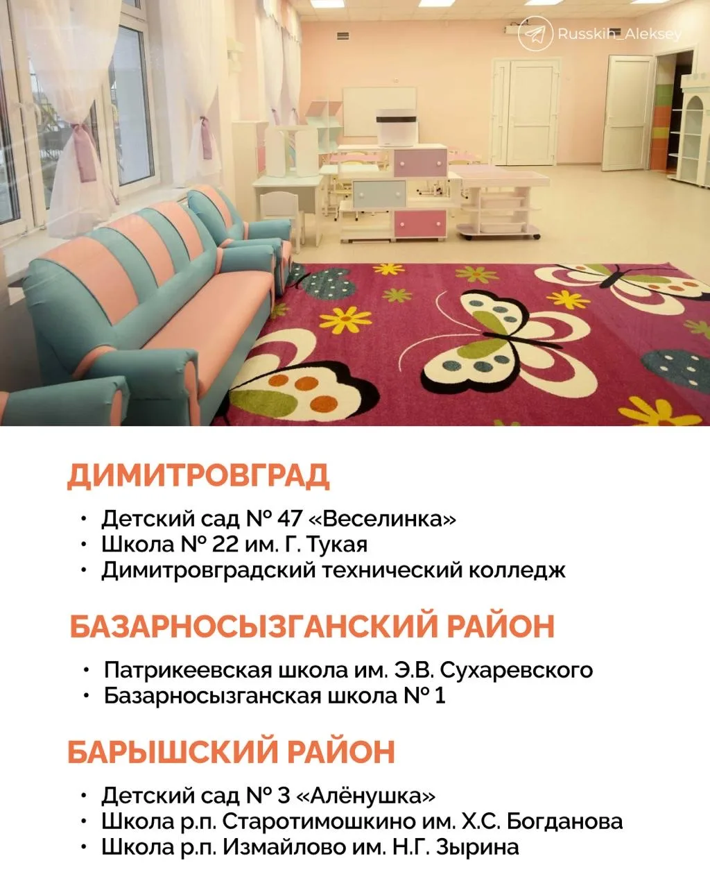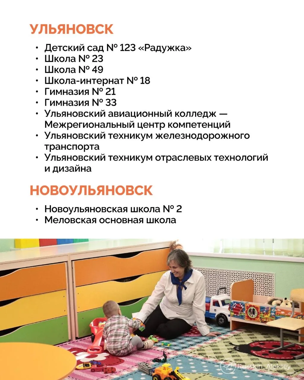 ▫️В этом году продолжим обновление. В нацпроект «Молодежь и дети» нам удалось включить семь корпусов пяти учреждений: Ульяновского авиационного колледжа, Димитровградского технического колледжа, Ульяновского техникума железнодорожного транспорта, Новоспасского технологического техникума, Ульяновского техникума отраслевых технологий и дизайна.
