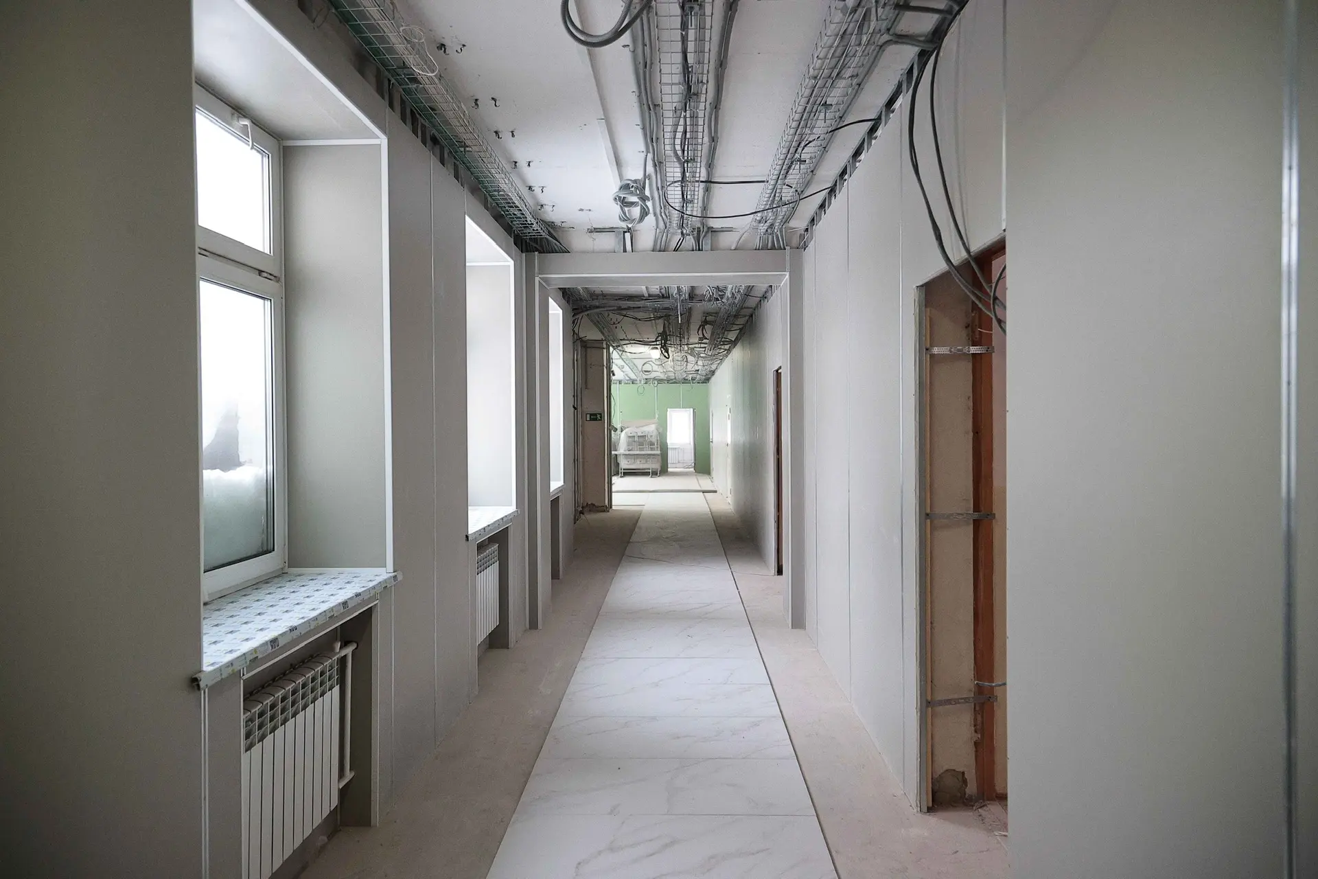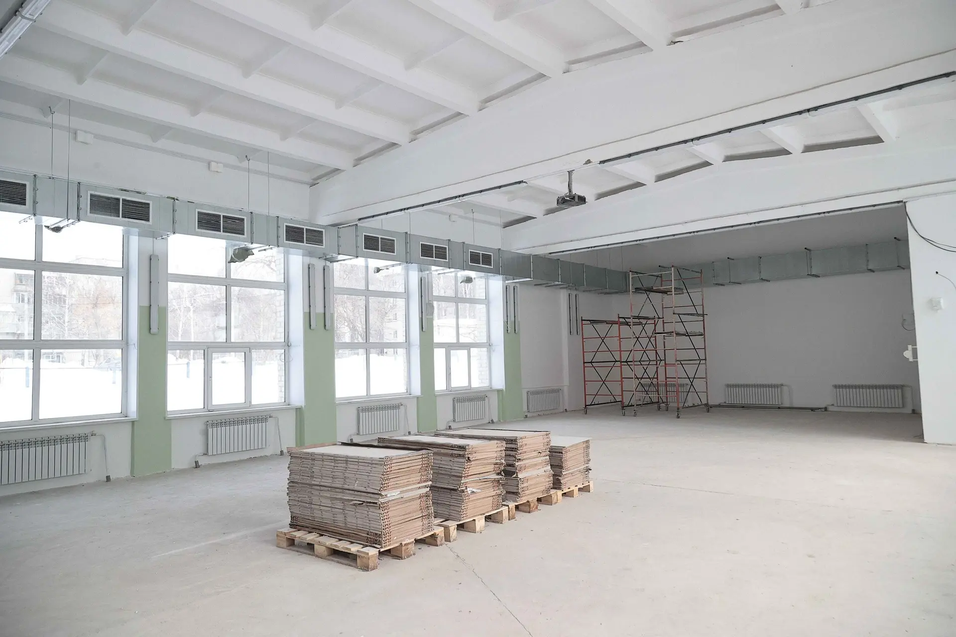 ▶️Заменили изношенные инженерные сети. Ведутся отделочные работы на 1 этаже, например, облицовка в медкабинете, санитарных помещениях и местах общего пользования. Полным ходом идет реконструкция столовой: делают оборудованный пищеблок и удобный обеденный зал. Для спортзала — новая система отопления, современное освещение и отделка, рядом раздевалки с душевыми.