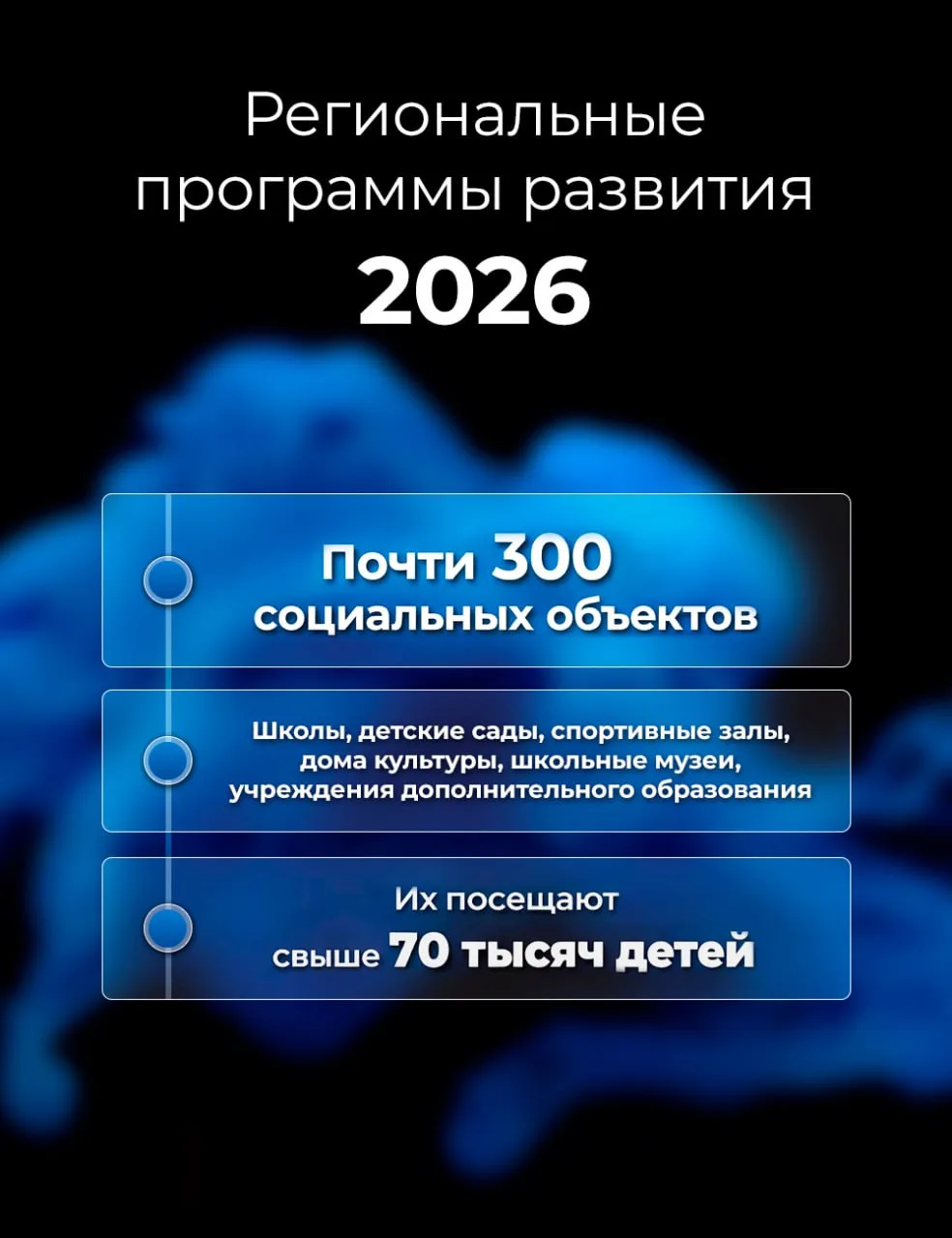 В этом году почти 300 социальных объектов приведем в порядок в рамках реализации региональных программ развития. В них включены школы, детские сады, дома культуры, школьные музеи, учреждения дополнительного образования. Их в общей сложности посещают свыше 70 тысяч детей.