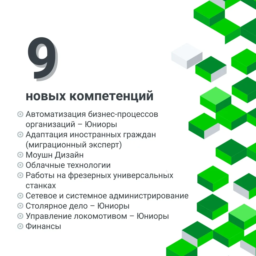 В этом году в список компетенций регионального чемпионата вошли новые направления: «Мастер высокой кухни», «Ювелирное дело», «Гид-экскурсовод», «Токарные работы на станках с ЧПУ», «Исполнительское мастерство (вокал)», «Горничная».