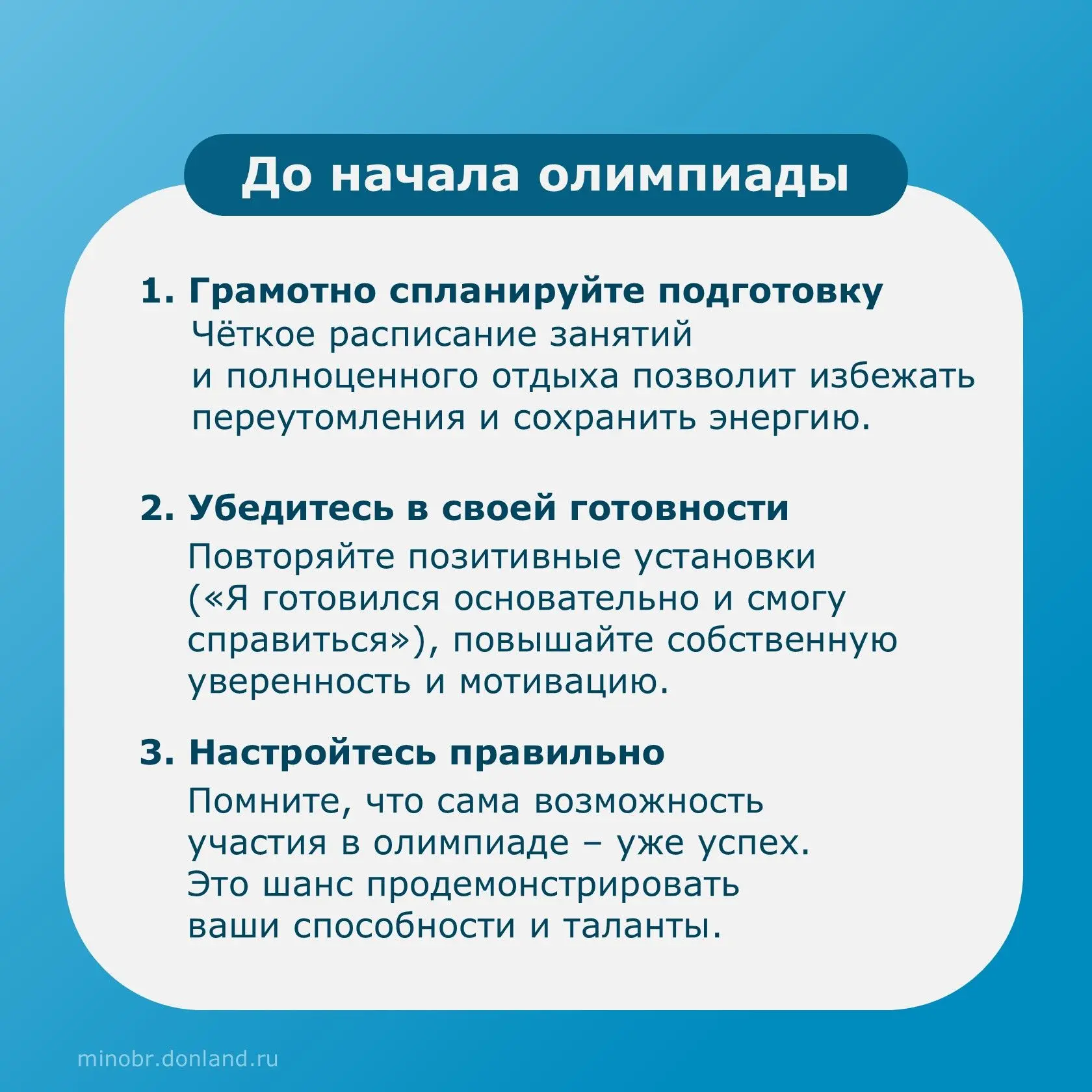Чтобы участники чувствовали себя уверенно и спокойно проходили олимпиаду, психологическая служба регионального центра «Ступени успеха» подготовила полезные рекомендации.