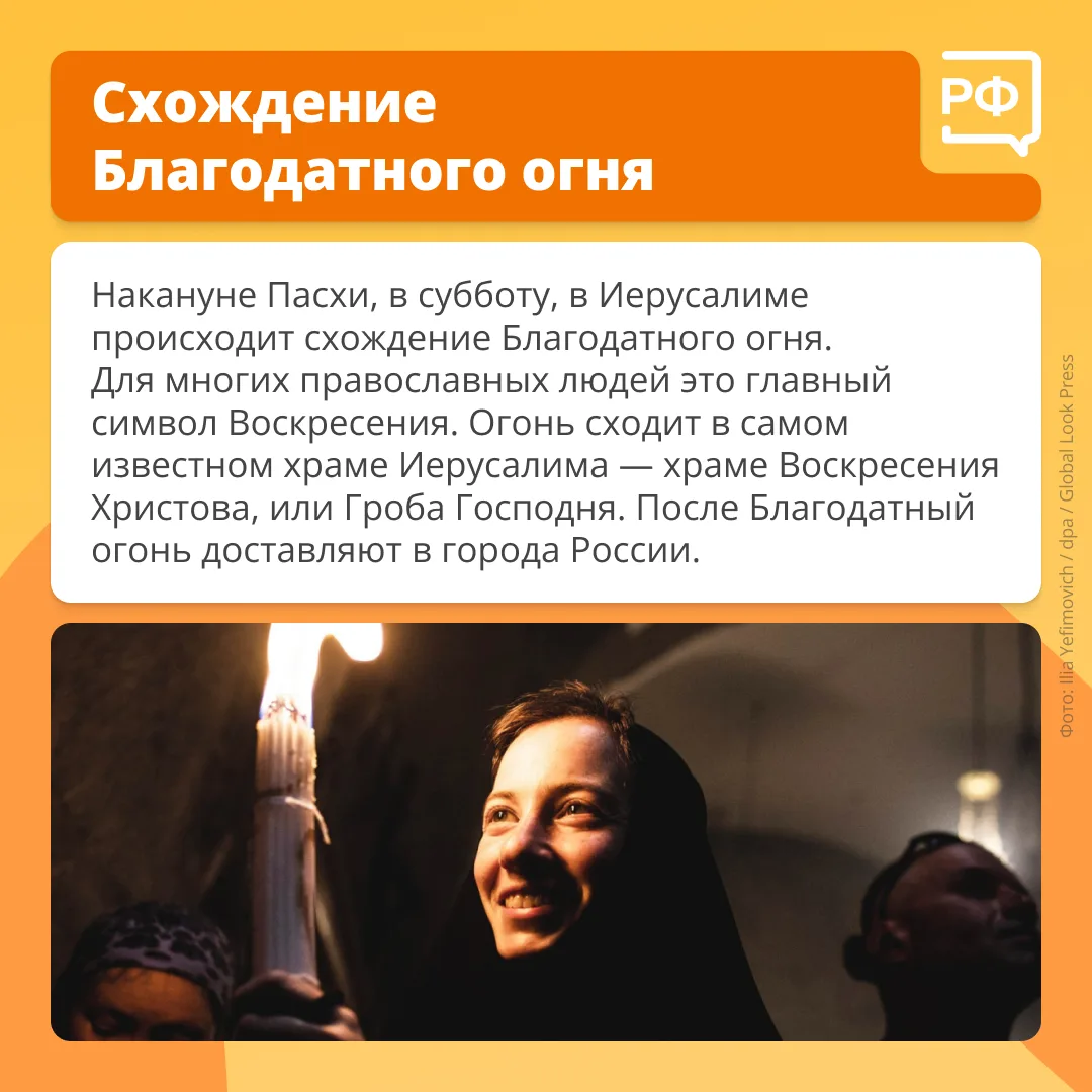 Огонь, который сходит в Великую субботу накануне православной Пасхи, считается одним из символов праздника. Ежегодно после молитв он появляется в часовне, возведенной над Гробом Господним. Она расположена в центре храма Воскресения Христова в Иерусалиме.