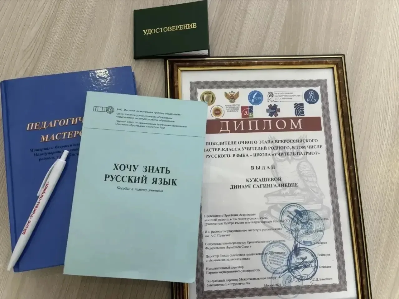 Министерство образования и науки Астраханской области поздравляет победителя в номинации «Учитель-патриот» XVII Всероссийского мастер-класса учителей родного, в том числе русского, языка - школа «Учитель Патриот», учителя русского языка и литературы МКОУ «СОШ № 1 с УИОП имени С.Г. Хуснетдинова МО «Ахтубинский район» Динару Кужашеву.