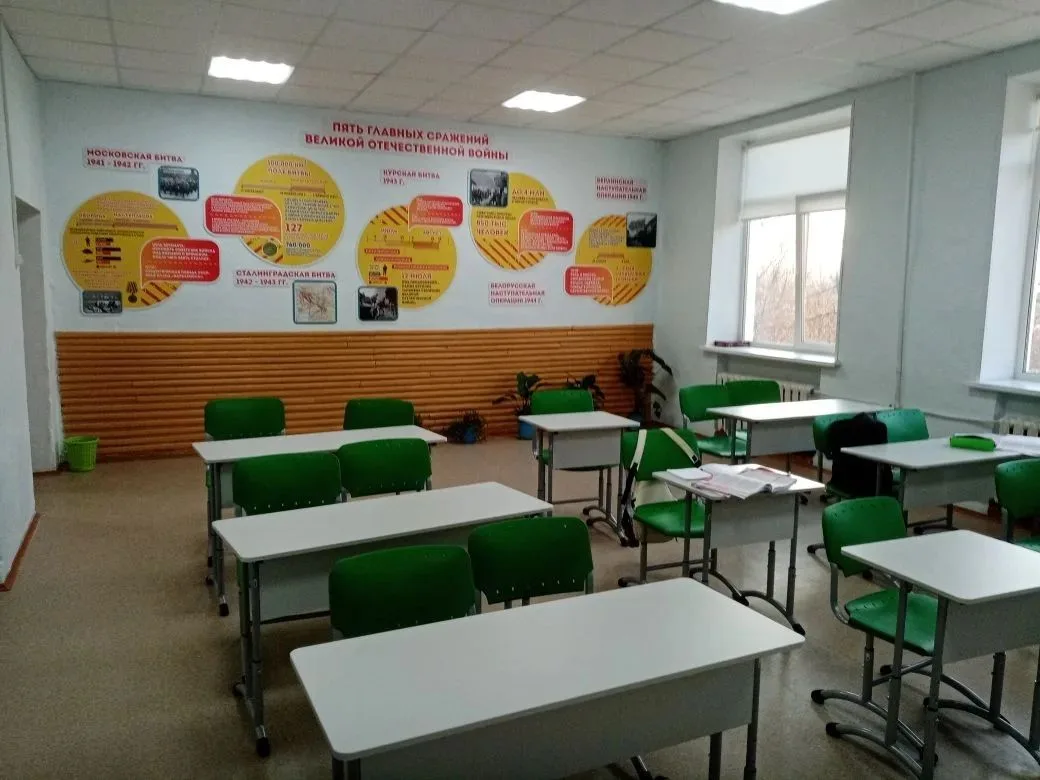 Обновлены кровля, входная группа, стены, полы и потолки. В классах появились новые двери. Пищеблок привели в порядок, а в спортзале уложили новое напольное покрытие.