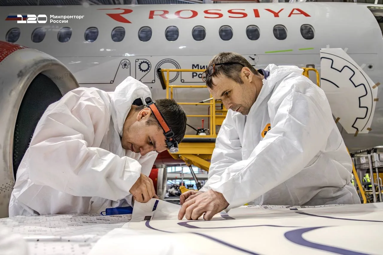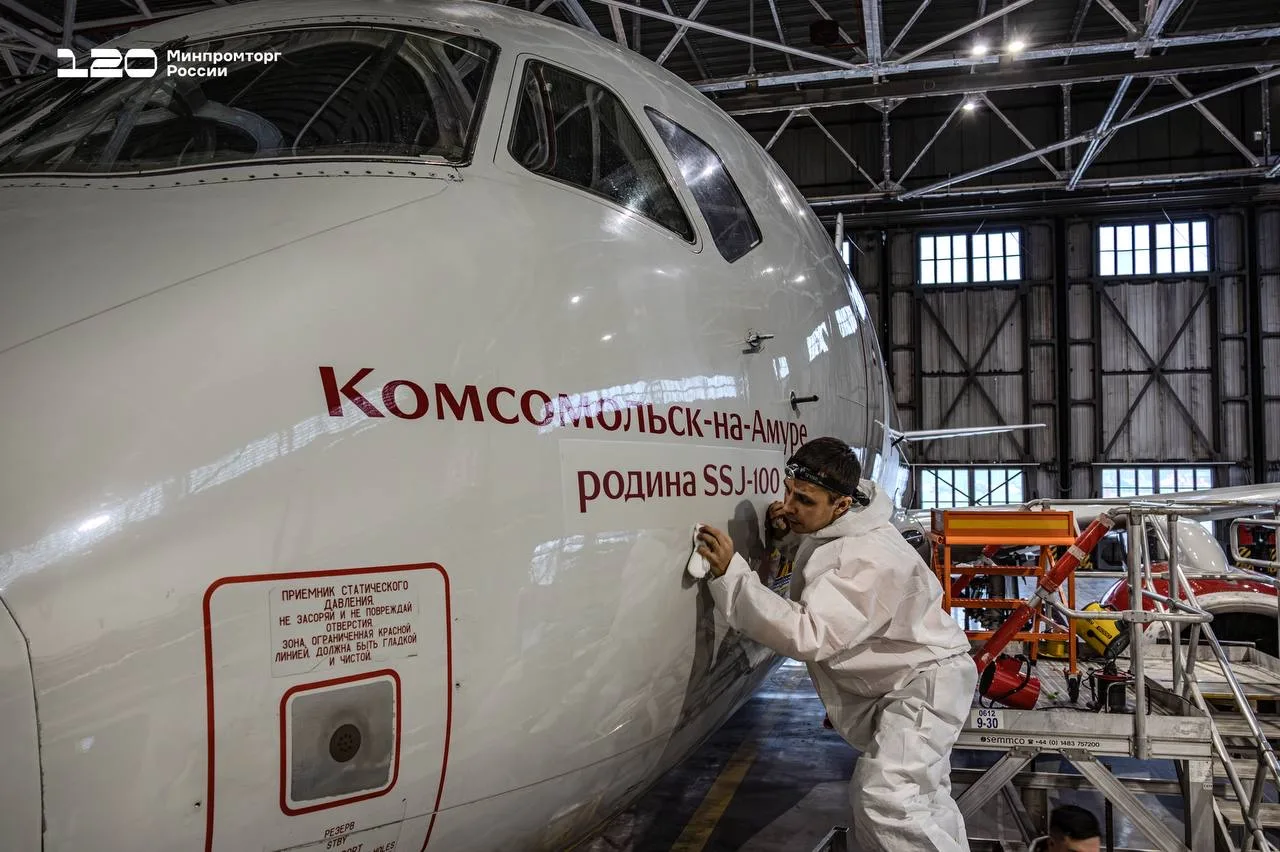 ⚙️Sukhoi Superjet 100 «Комсомольск-на-Амуре» (бортовой номер RA-89044) украшен элементами юбилейного фирменного стиля Минпромторга России.