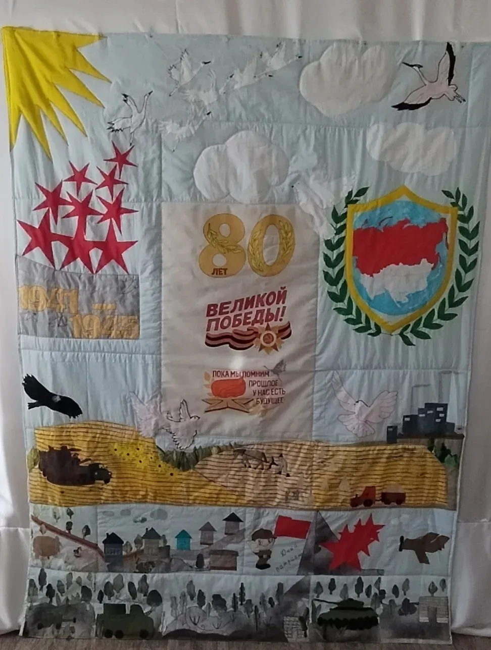 Девушки представили жюри своё творение — лоскутное одеяло размером два метра на полтора, объединяя в нём образы мирной трудовой деятельности и подвигов героев Отечества.