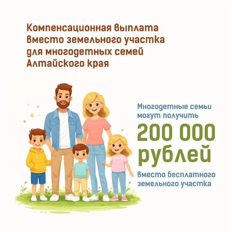 Многодетный семьи Алтайского края могут получить 200 тысяч рублей вместо бесплатного земельного участка.