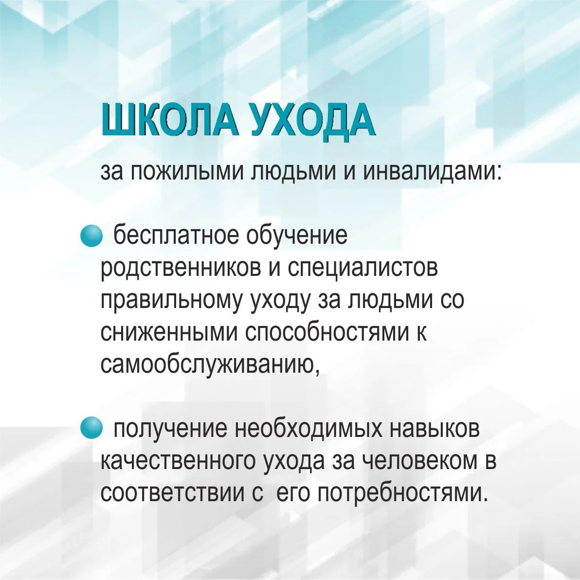 Школы ухода предлагают бесплатное обучение родственников и специалистов правильному уходу за людьми с выраженным снижением способности к самообслуживанию, получение необходимых навыков качественного ухода в соответствии с потребностями нуждающегося в помощи человека.