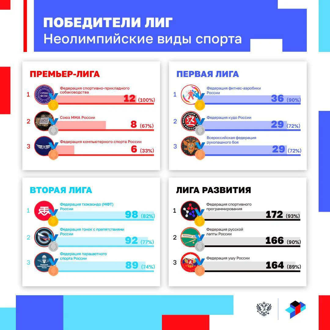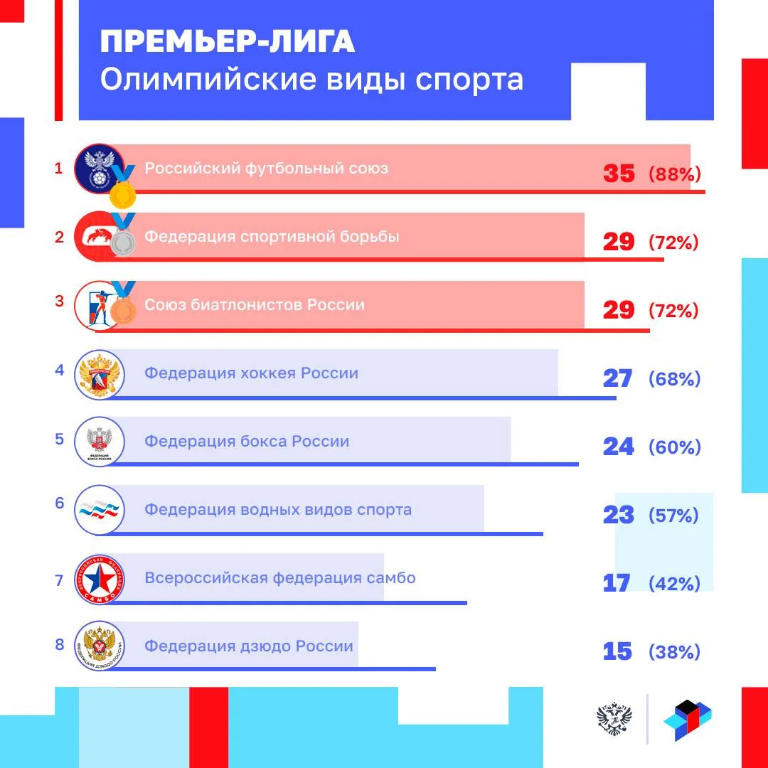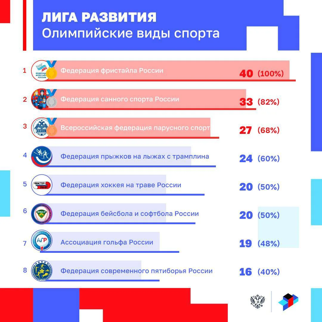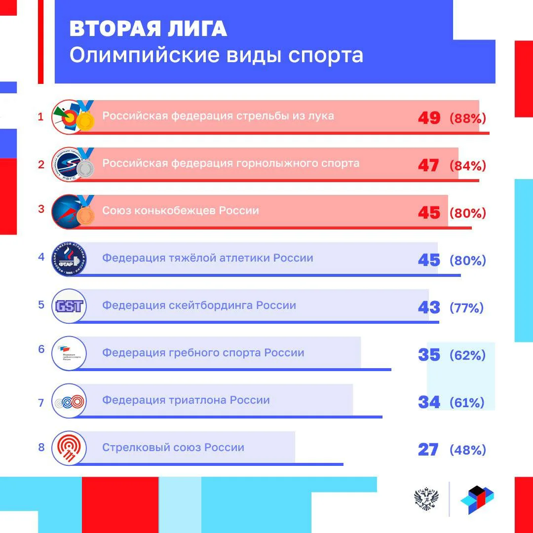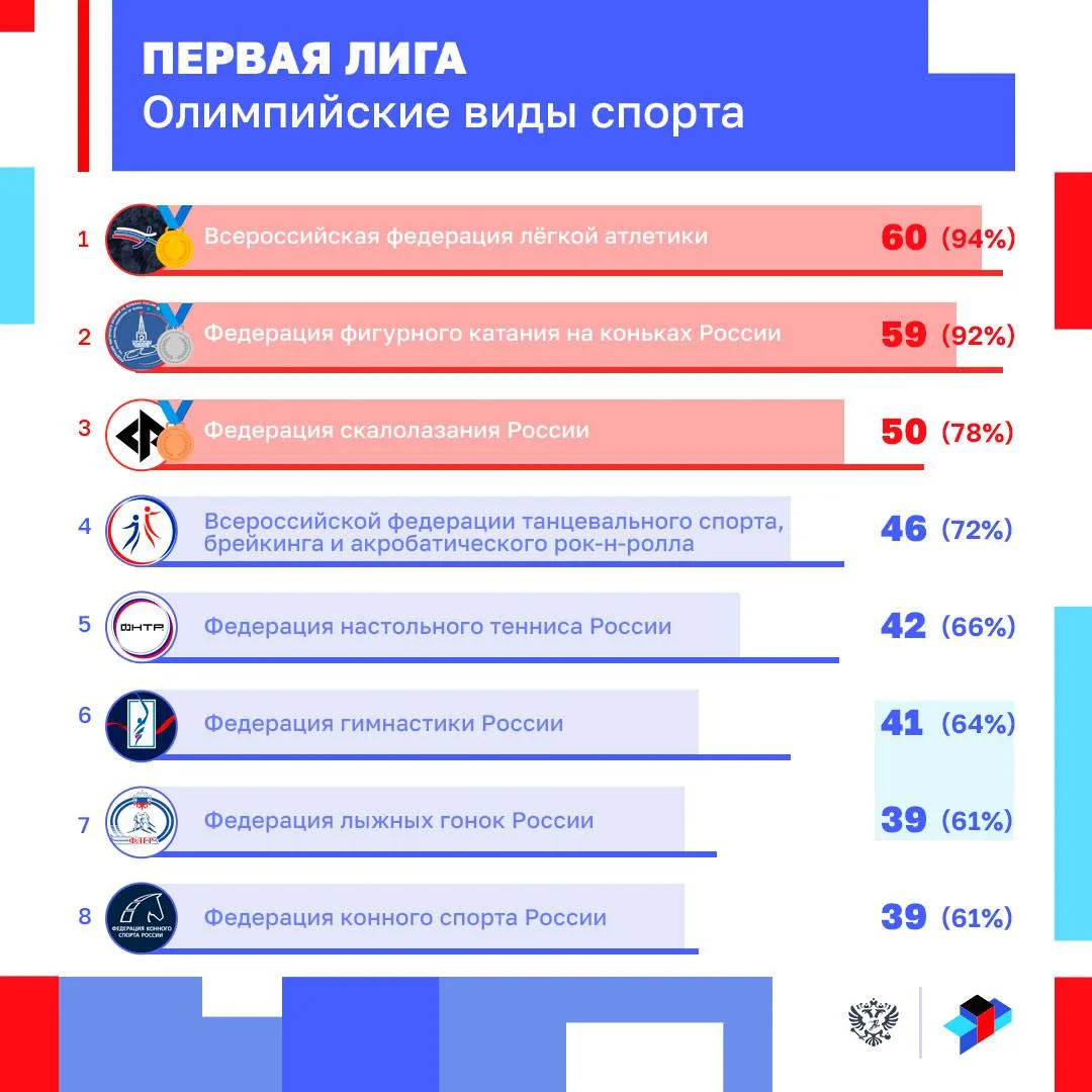 🥈 Федерация санного спорта России также осталась в числе сильнейших, подтвердив стабильность интереса к зимним видам спорта.