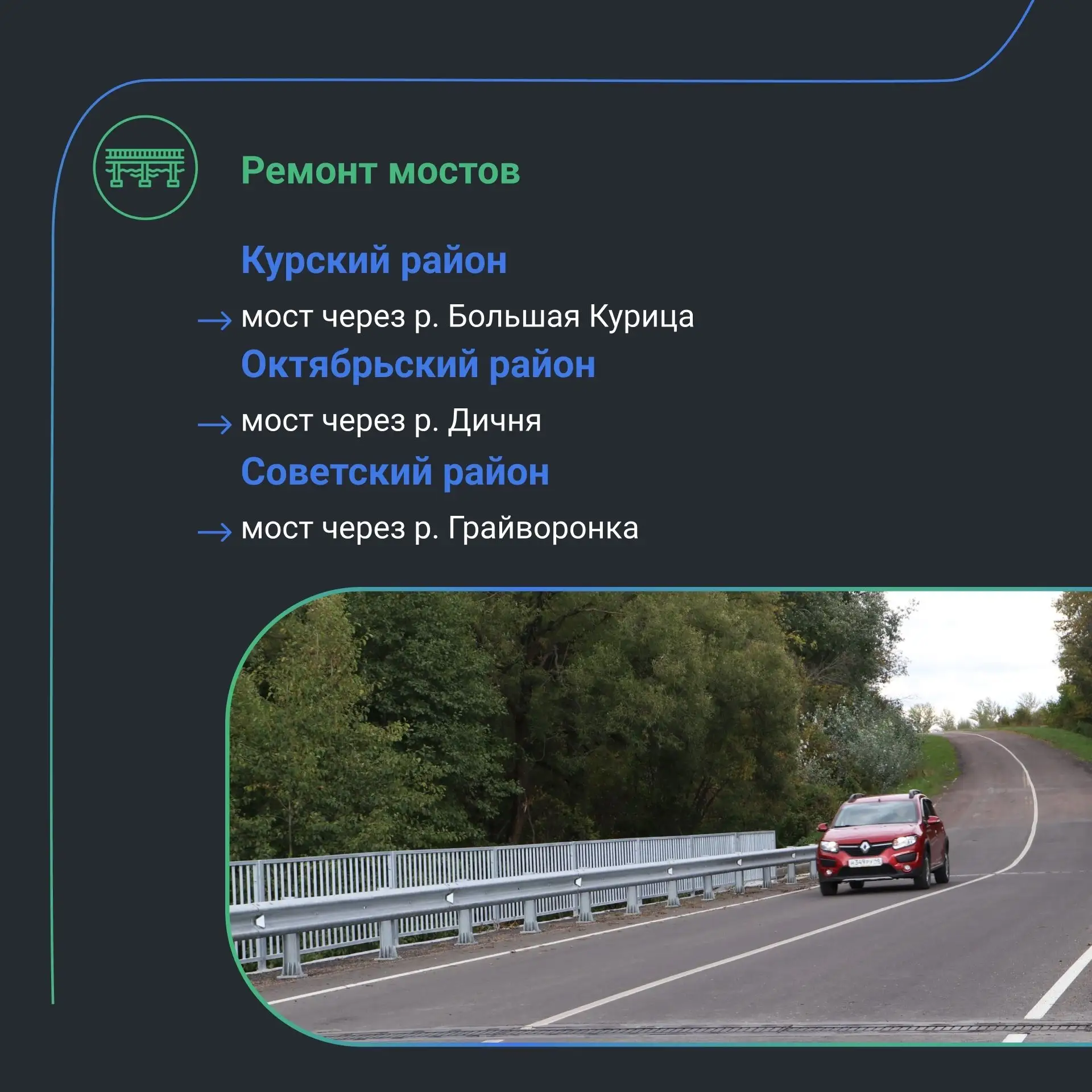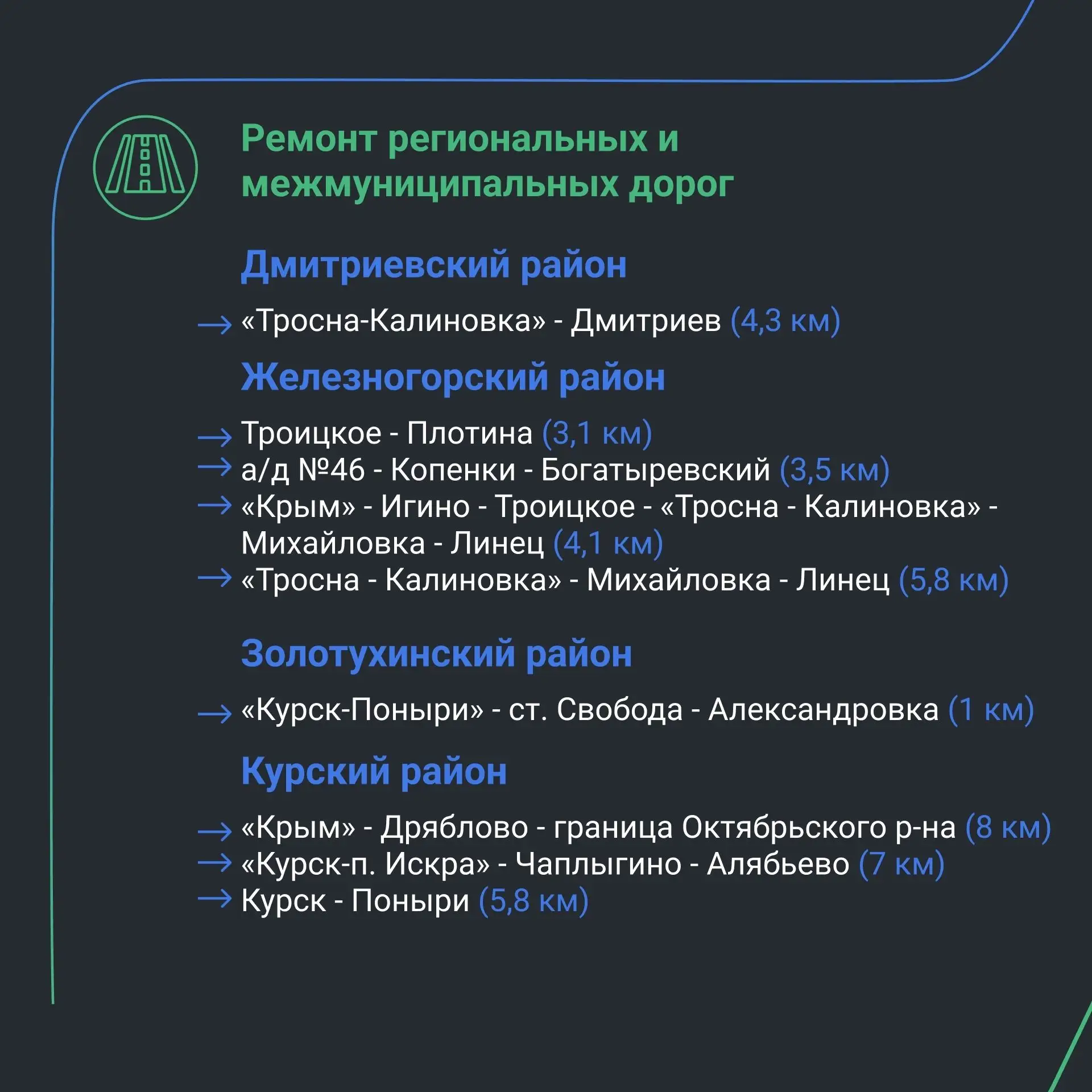 В рамках федерального проекта «Региональная и местная дорожная сеть» национального проекта «Инфраструктура для жизни» в Курской области в 2026 году запланирован ремонт 29 участков автомобильных дорог регионального и межмуниципального значения общей протяжённостью 200,5 километра. А также — три искусственных сооружения в Октябрьском, Советском и Курском районах.