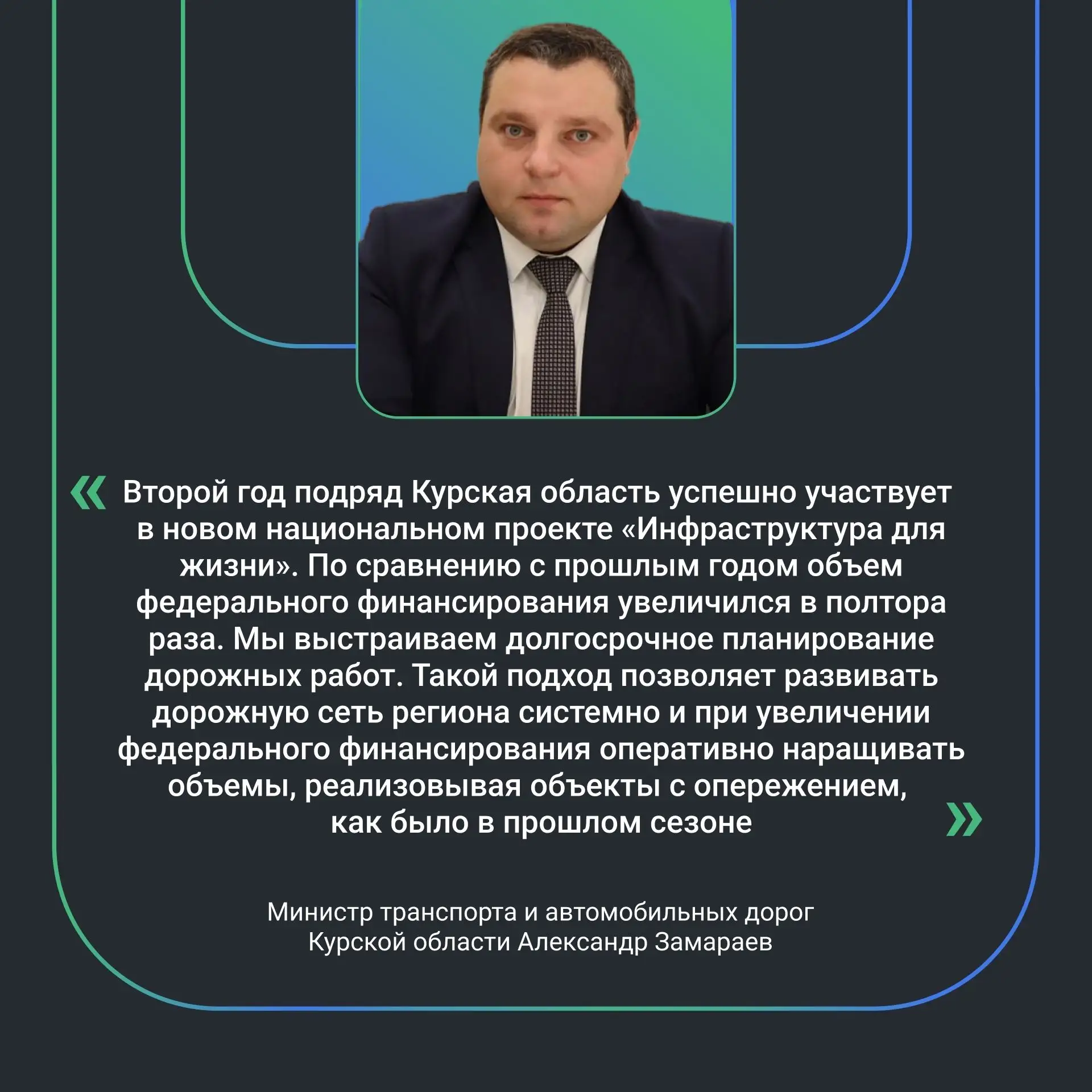 «Второй год подряд Курская область успешно участвует в новом национальном проекте «Инфраструктура для жизни». По сравнению с прошлым годом объём федерального финансирования увеличился в полтора раза. Мы выстраиваем долгосрочное планирование дорожных работ. Такой подход позволяет развивать дорожную сеть региона системно и при увеличении федерального финансирования оперативно наращивать объемы, реализовывая объекты с опережением, как было в прошлом сезоне», — отметил министр транспорта и автомобильных дорог Курской области Александр Замараев.
