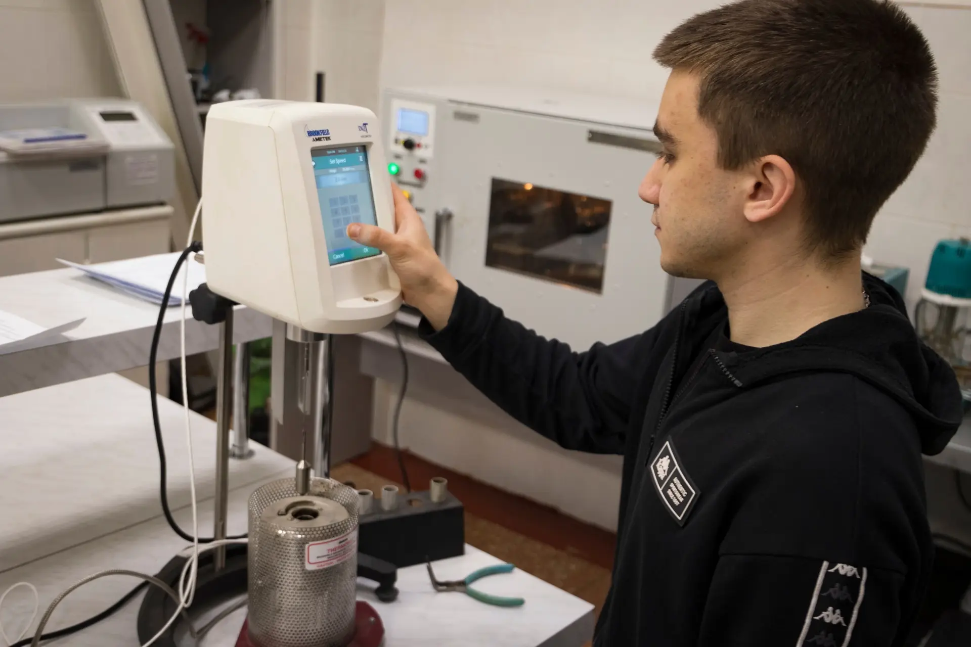 В лаборатории проверяют все компоненты будущего покрытия: песок, щебень, битум, минеральный порошок и отсев дробления. При этом более 60% материалов — местного производства.