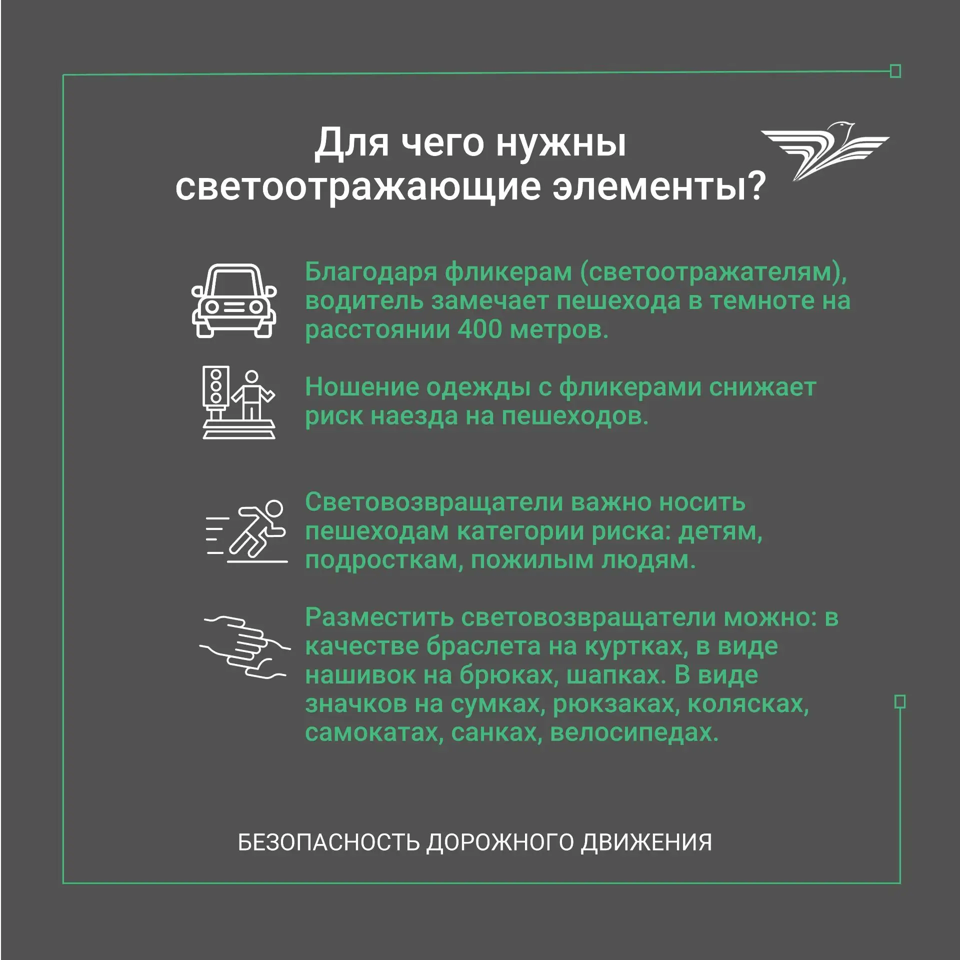 Лучший способ избежать таких аварий — использовать одежду🦺 и аксессуары со световозвращающими элементами. Их использование снижает риск наезда на пешехода на 65–80%.
