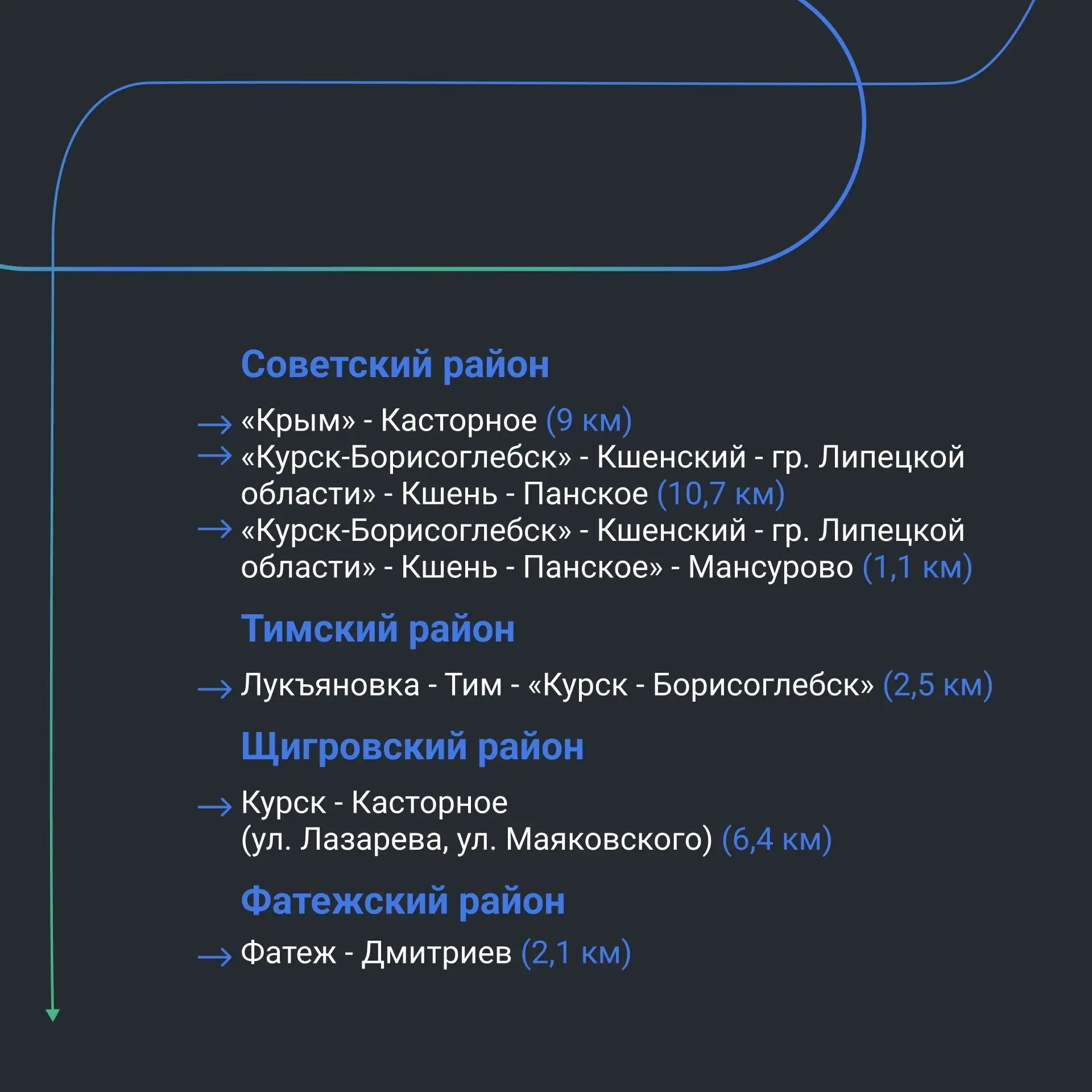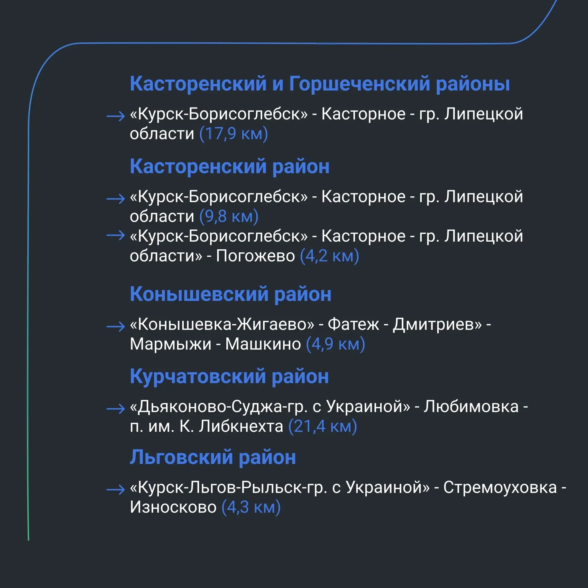 📍Самый протяжённый из переходящих объектов — дорога «Курск — Борисоглебск» — Касторное — граница Липецкой области. Она обеспечивает подъезд к маслоэкстракционному заводу — одному из крупнейших предприятий федерального уровня.