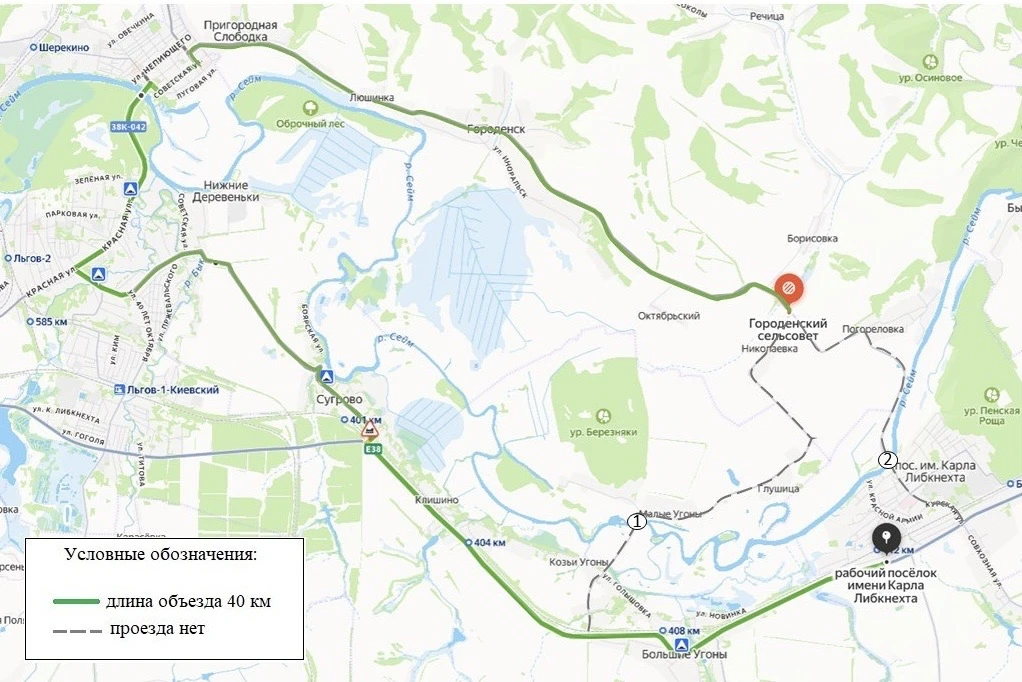 В ближайшие дни специалисты установят соответствующие дорожные знаки и необходимые ограждения. На период паводка объезд данного участка организован через город Льгов. Схема маршрута представлена на карточке.