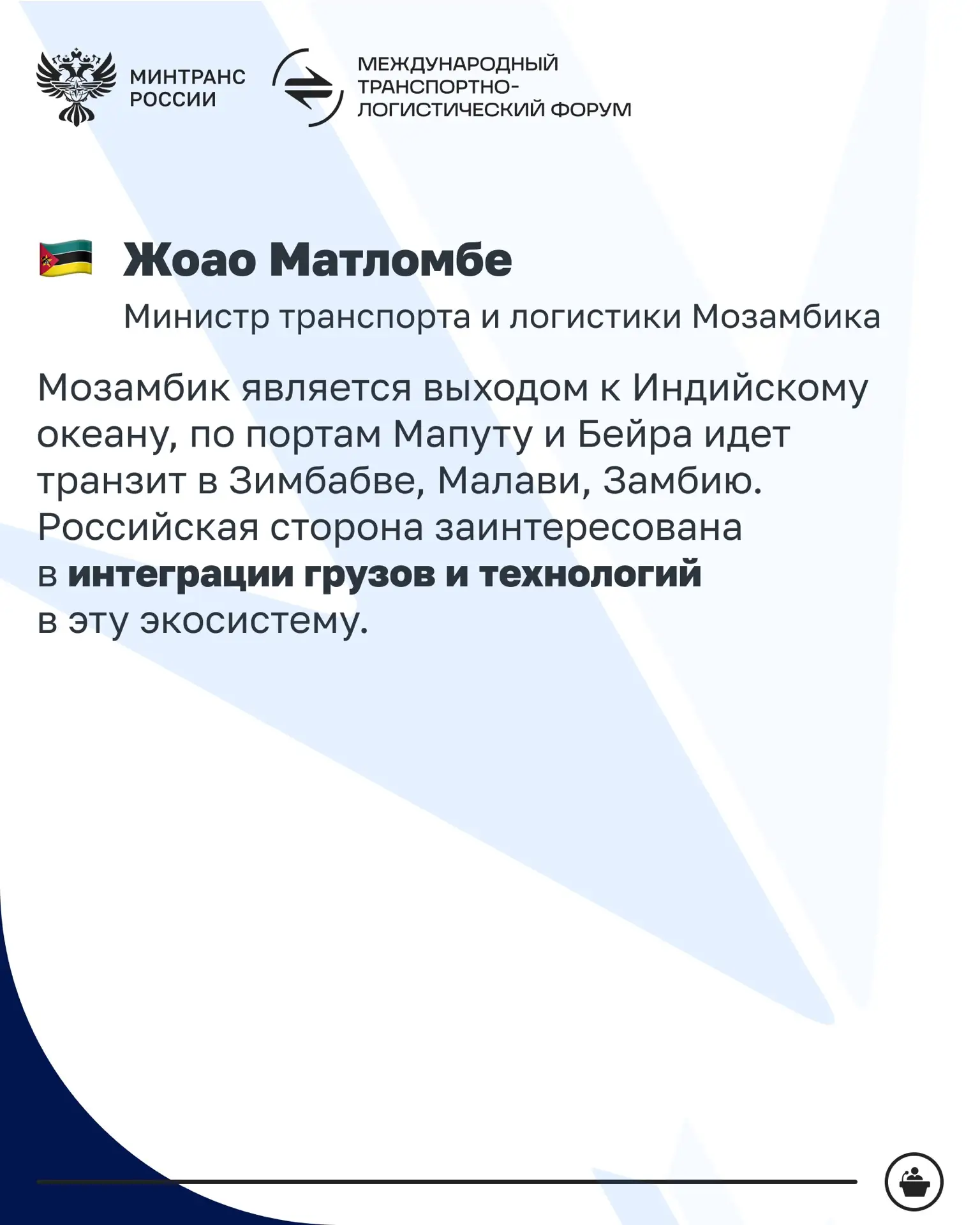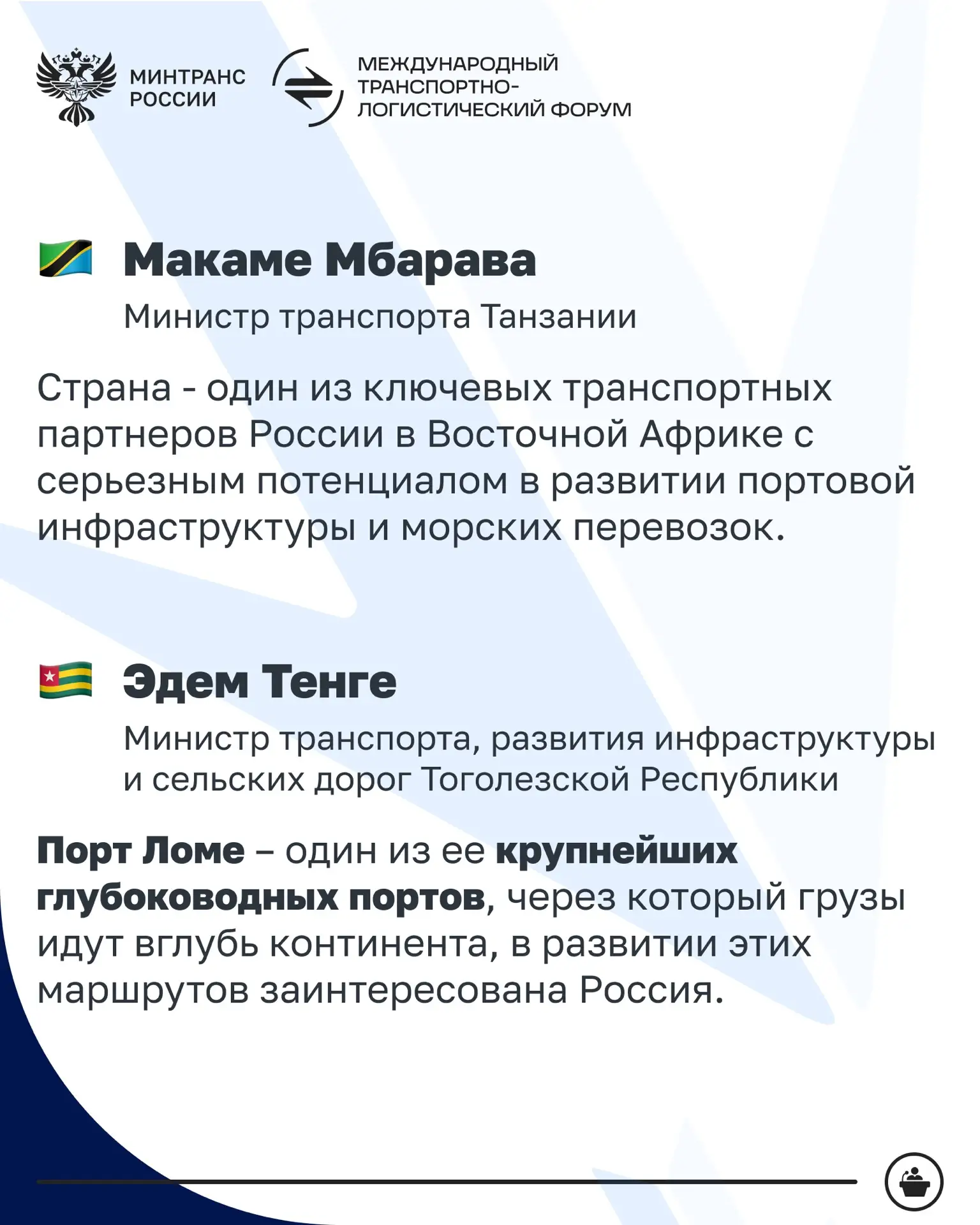 Об этом сообщил Министр транспорта Объединенной Республики Танзания Макаме Мняа Мбарава на пленарном заседании «Транспортная связанность как основа нового миропорядка: от глобальной конкуренции к всеобщей безопасности».