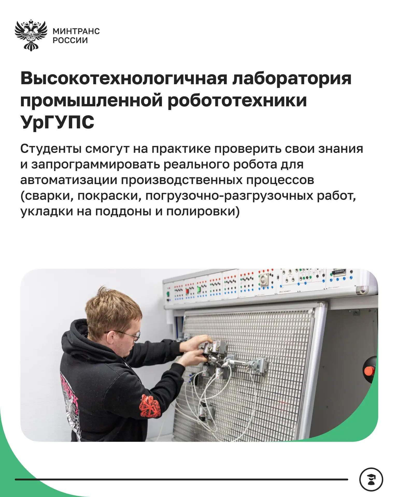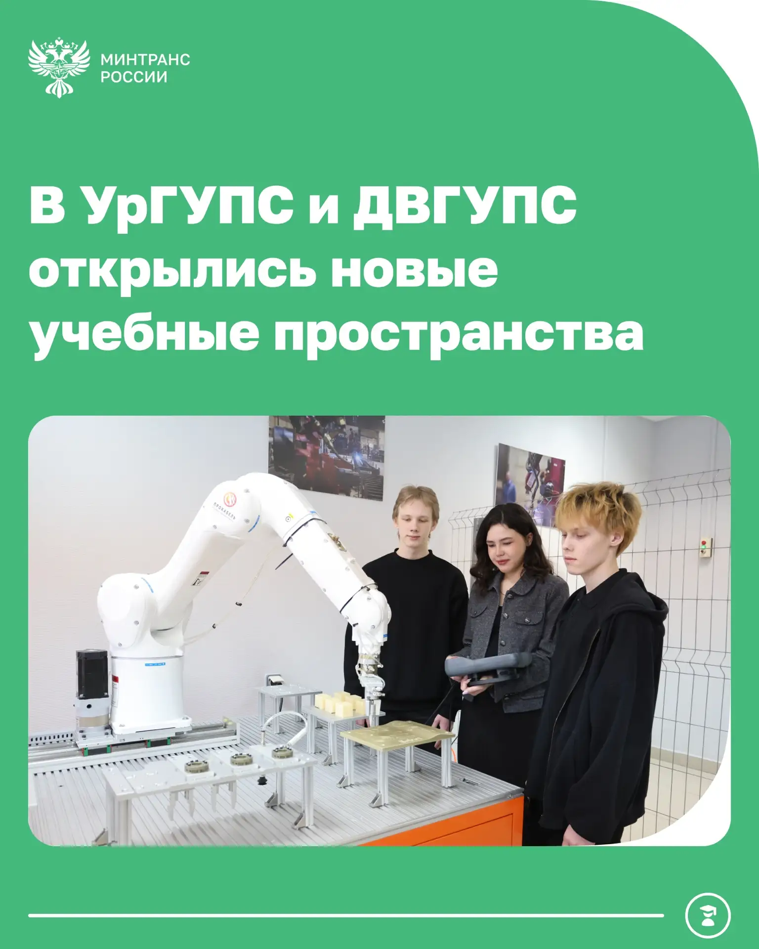 ▶️В УрГУПС заработала лаборатория промышленной робототехники, оснащенная инновационным оборудованием для обучения программированию реальных роботов-манипуляторов. Студенты смогут отрабатывать навыки автоматизации производственных процессов и работать с высокотехнологичным комплексом на базе 6-осевого робота Regal.
