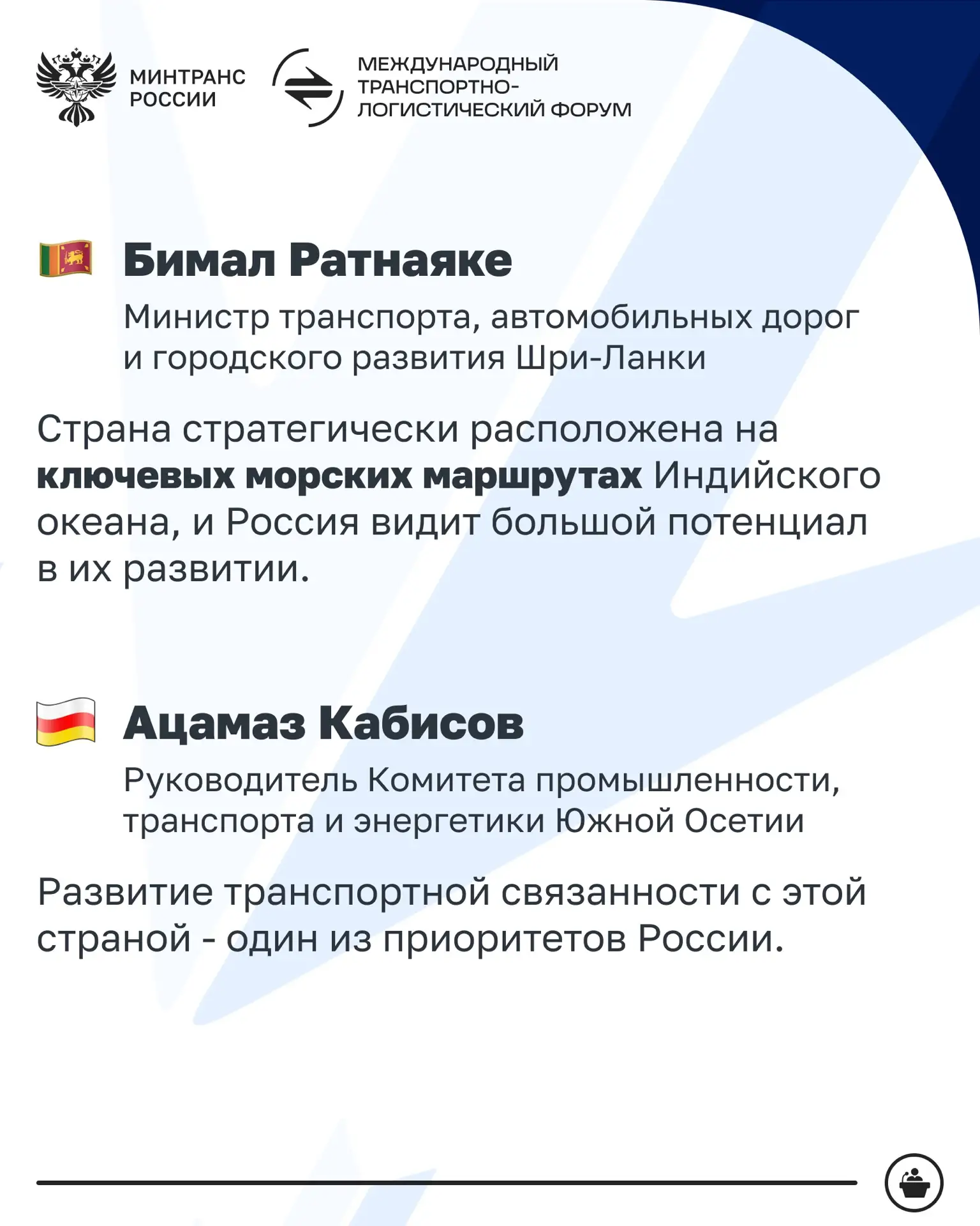 «Мы выражаем признательность Российской Федерации за поддержку энергетического сектора нашей страны. Связанность транспорта – это не только возможность попасть из одной точки в другую, это также продовольственная и энергетическая безопасность. Мы стремимся сотрудничать с нашими глобальными партнерами для развития международных логистических коридоров», – отметил Бимал Ратнаяке.