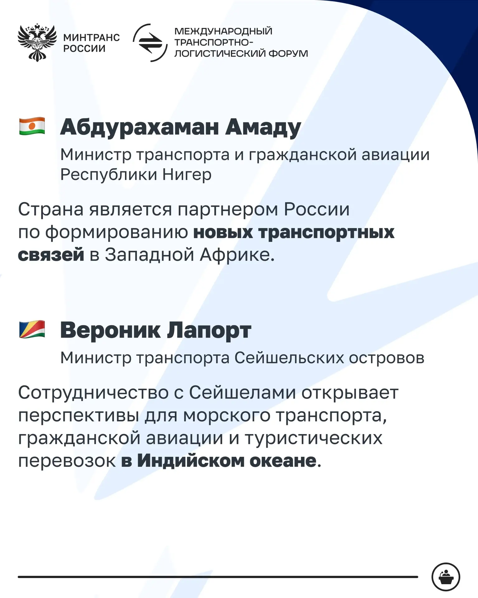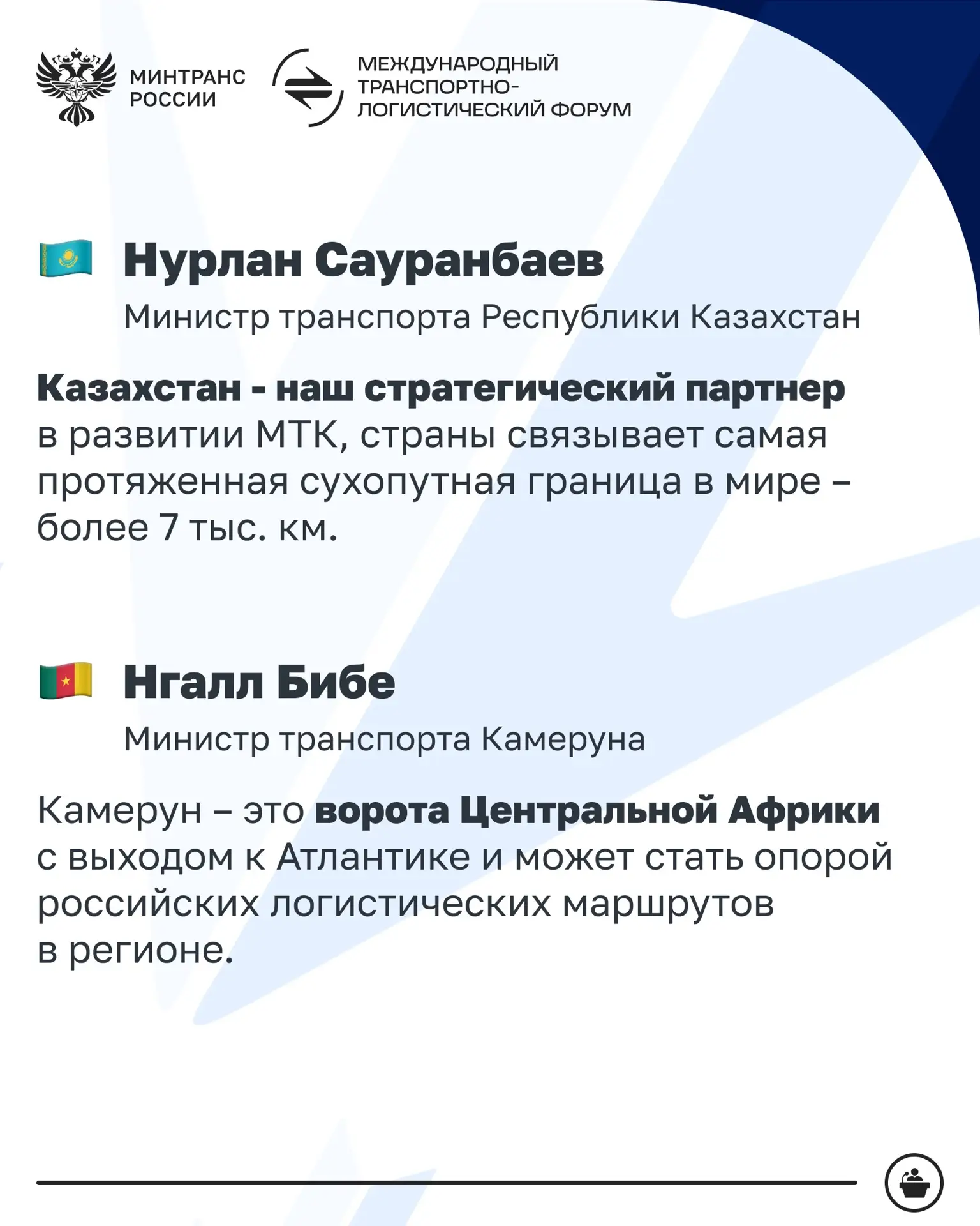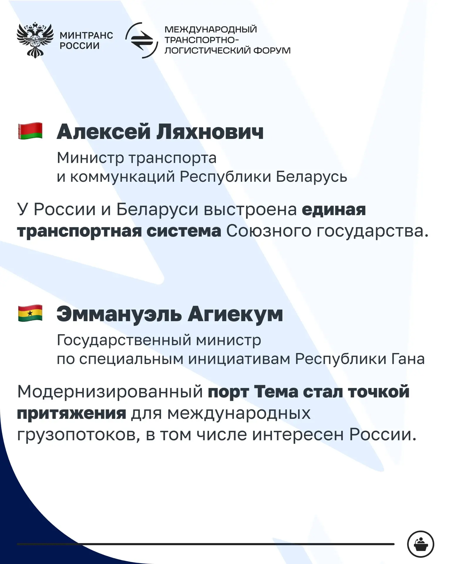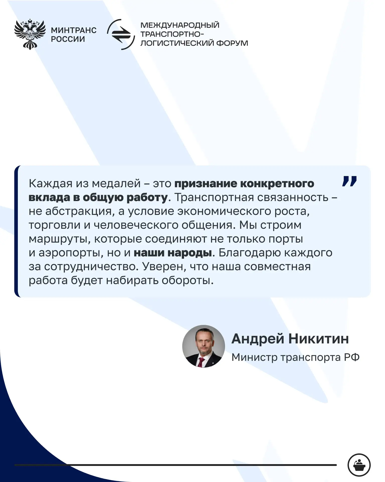 «Для меня большая честь вручить медали «За взаимодействие» нашим зарубежным коллегам на первом Международном транспортно-логистического форуме. Ваш личный вклад в развитие транспортного сотрудничества с Россией заслуживает особого признания, ведь транспорт – не просто отрасль экономики, а язык международного общения без переводчика. Каждый новый маршрут, подписанное соглашение, совместный проект – это мосты доверия между нашими народами», – обратился министр транспорта к зарубежным гостям.