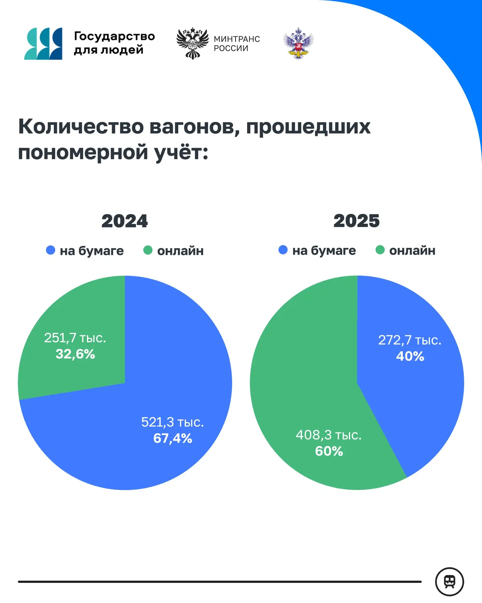 Переход в «цифру» заметен и по количеству вагонов, прошедших пономерной учет. В 2025 году его прошли 681 тыс. вагонов, из них 60% получили номер онлайн. Годом ранее было учтено 773 тыс. вагонов, но большая часть (67,4%) оформлялась на бумаге.