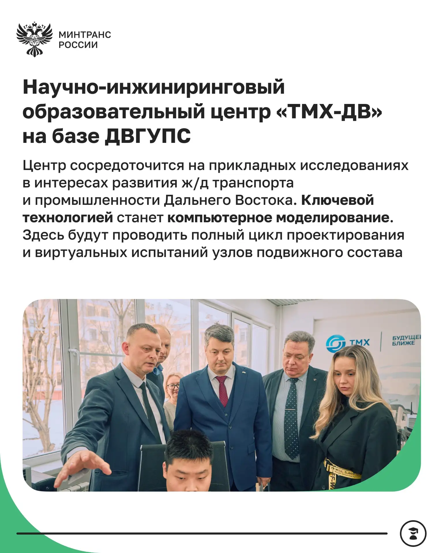 ▶️В ДВГУПС начал работу Научно-инжиниринговый образовательный центр «ТМХ-ДВ». Здесь будут разрабатывать перспективные технологические решения для транспортного машиностроения в интересах развития железнодорожного транспорта Дальнего Востока.