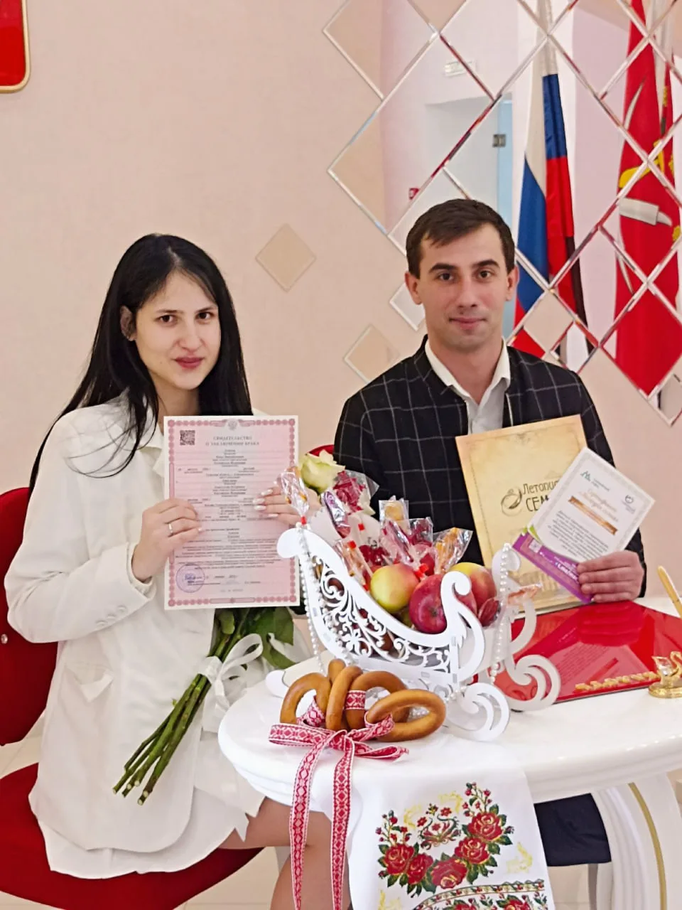 Начальник отдела ЗАГС Людмила Орехова вручила паре гербовый документ о заключении брака и памятный подарок «Летопись» от Губернатора Дмитрия Миляева.