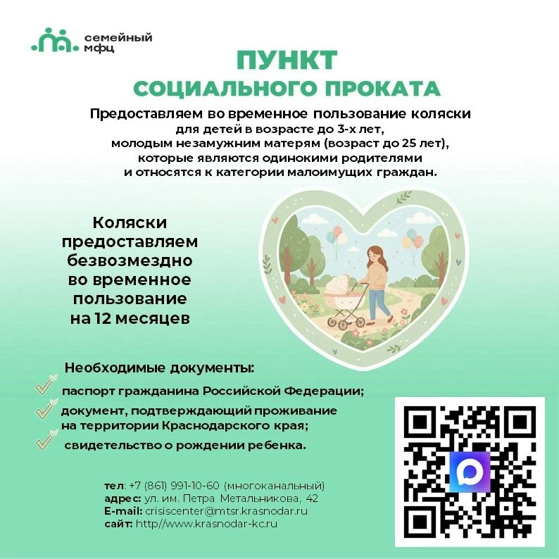✅ В Семейном многофункциональном центре г. Краснодара работает «Пункт социального проката». Во временное пользование можно взять коляску для ребёнка в возрасте до трёх лет. Срок проката − до 12 месяцев. При необходимости договор можно продлить.