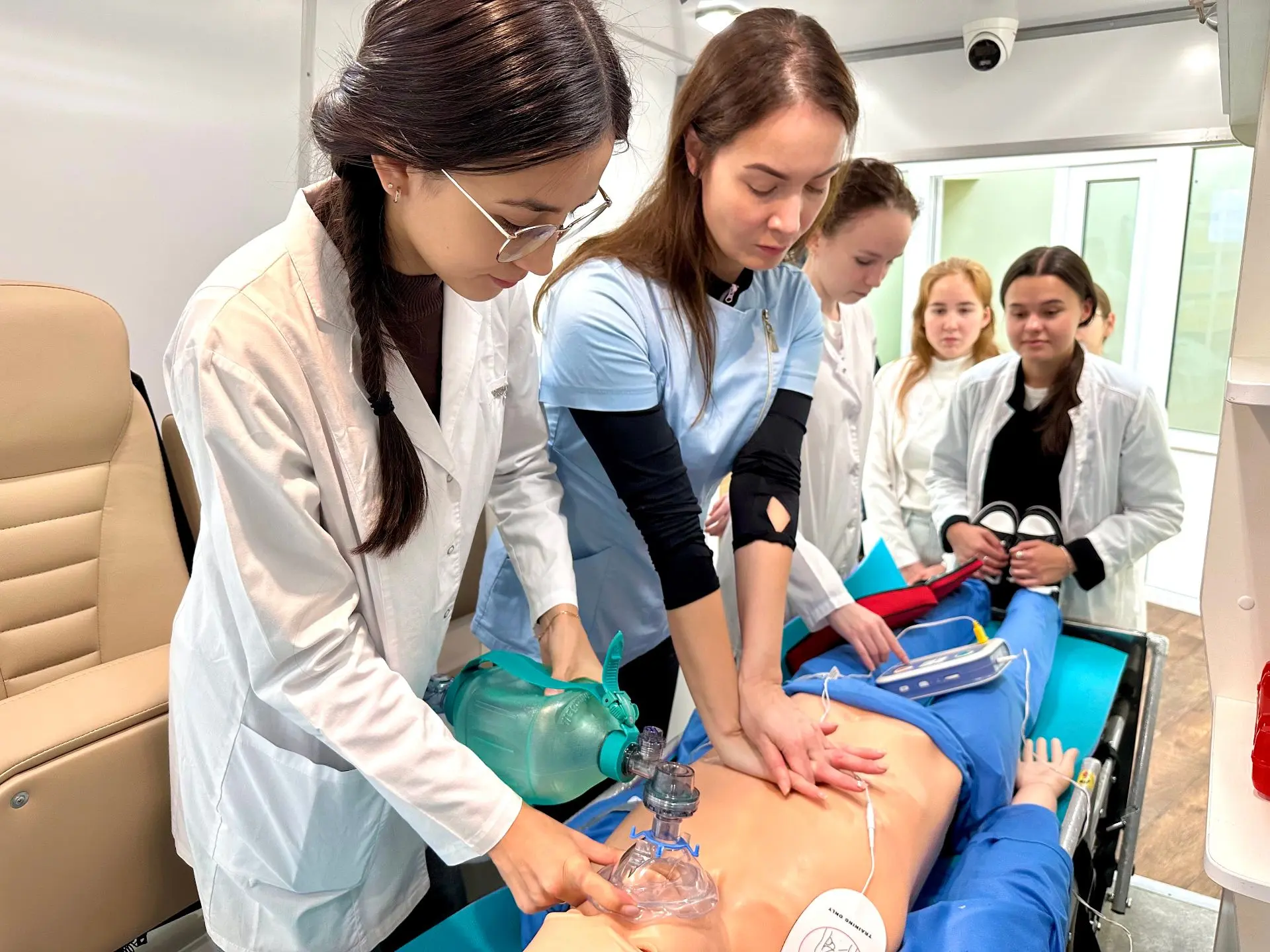 На этой неделе ординаторы проходят обучение на тренажерном комплексе «Макет автомобиля скорой медицинской помощи». Этот уникальный симулятор позволяет отрабатывать различные аспекты оказания экстренной медицинской помощи в условиях, максимально приближенных к реальности.