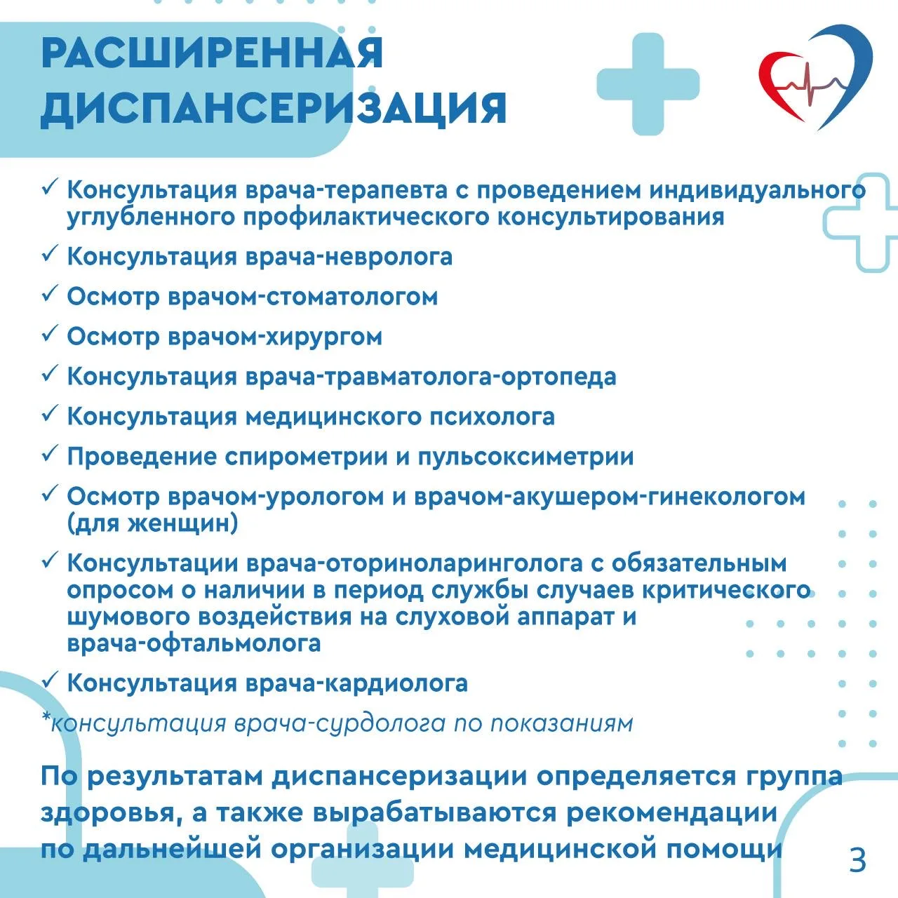 — Краткие консультации терапевта, кардиолога, эндокринолога.