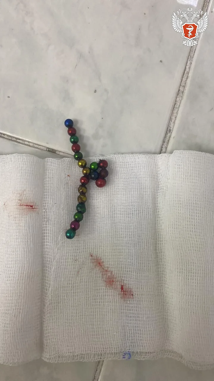 ➡️ В ходе обследования врачи приняли решение о проведении операции. В ходе хирургического вмешательства в толстой кишке были обнаружены 19 магнитов, которые, притягиваясь друг к другу через стенки кишечника, вызвали сдавление тканей и формирование двойной перфорации. Развилось воспаление брюшной полости — жизнеугрожающее состояние.