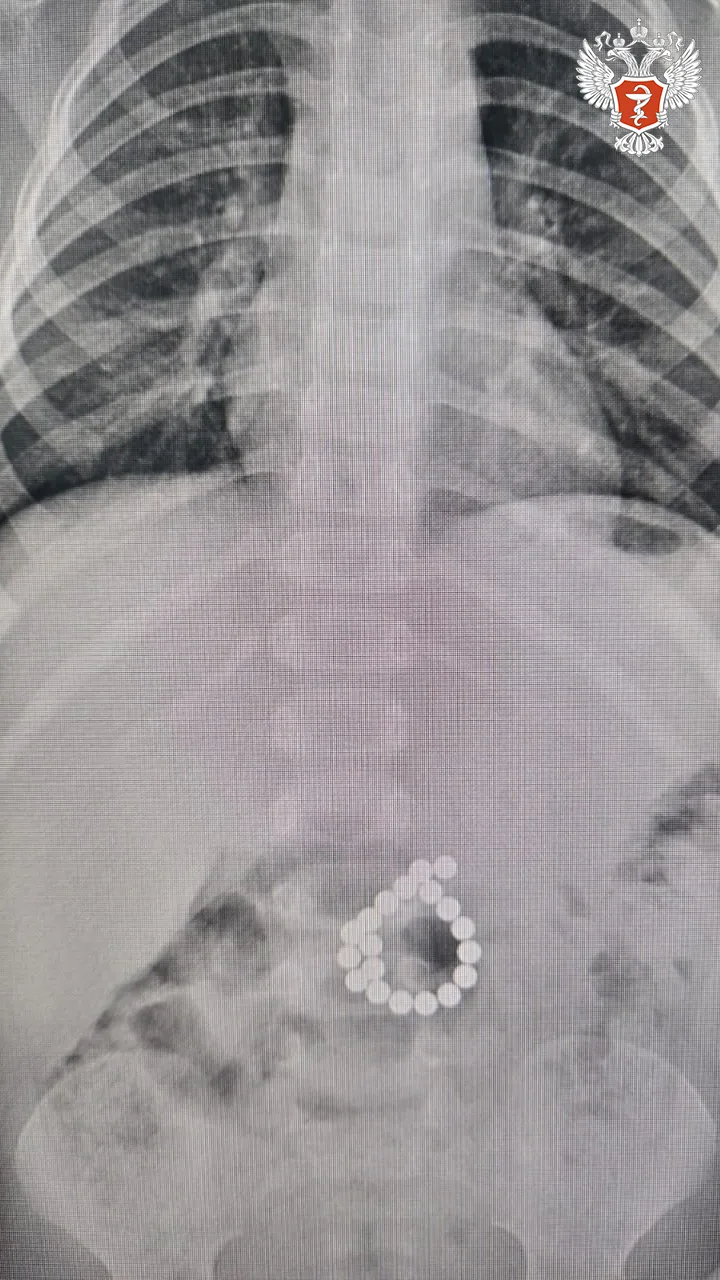 Пациент поступил в Сургутский окружной клинический центр охраны материнства и детства с высокой температурой и выраженным болевым синдромом в животе. За несколько дней до ухудшения состояния ребёнок играл с магнитным конструктором и проглотил несколько деталей.