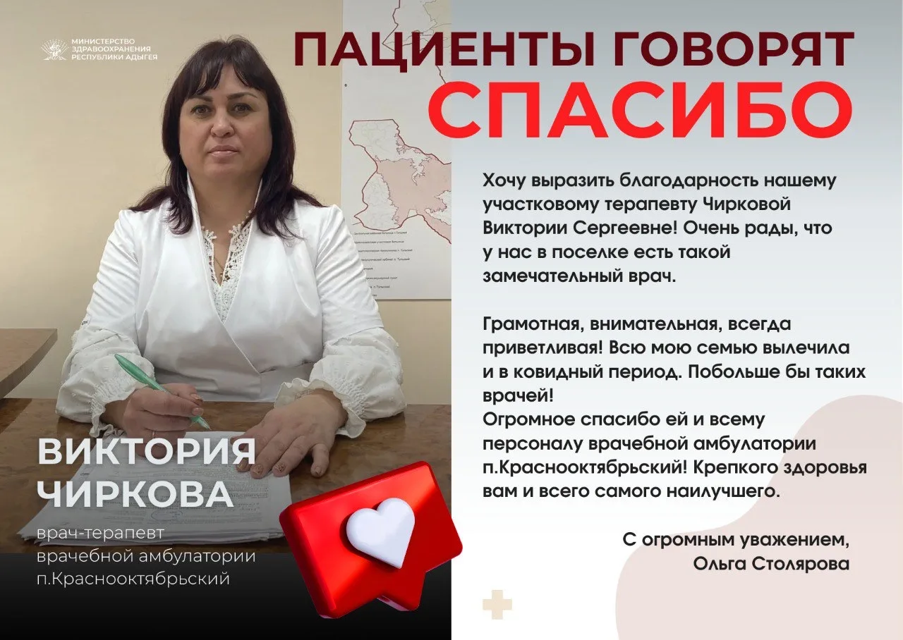 Сегодня пациент говорит спасибо врачу-терапевту врачебной амбулатории п.Краснооктябрьский — Виктории Чирковой и министру здравоохранения Адыгеи Рустему Меретукову за строительство новой, комфортной врачебной амбулатории в посёлке.