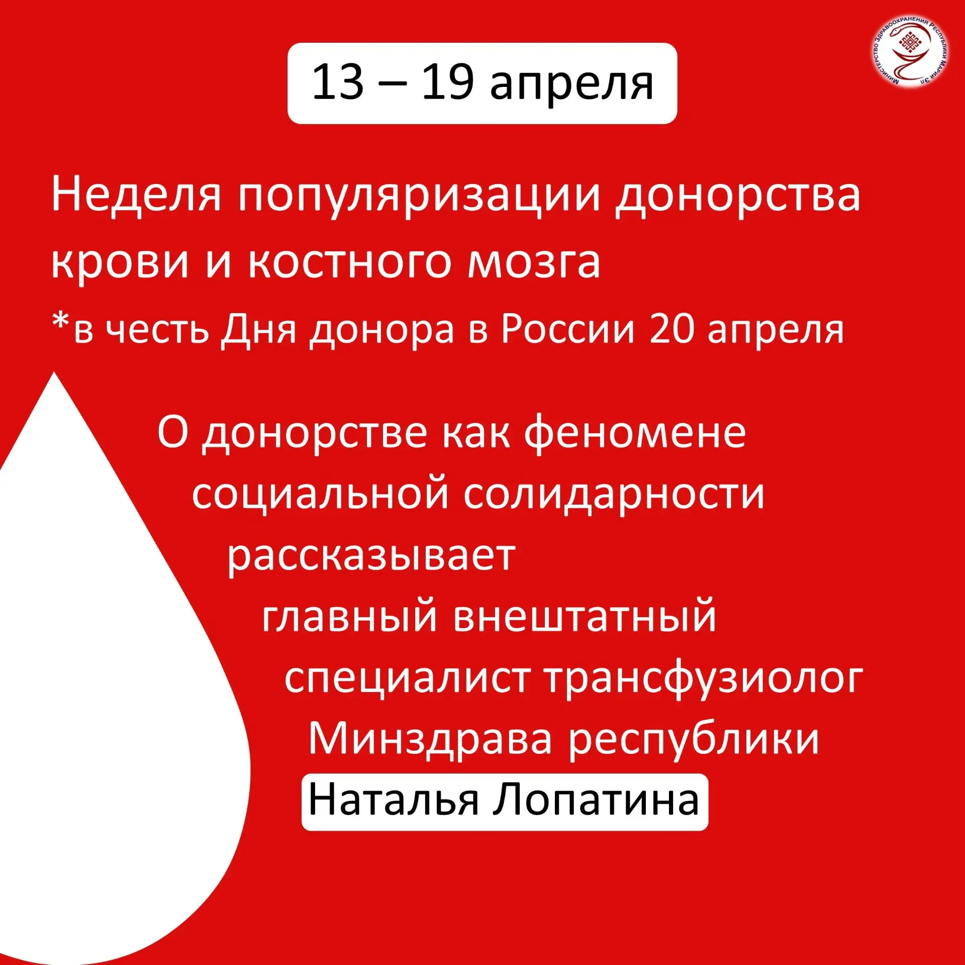 🔔 Ежегодно 20 апреля в России мы отмечаем Национальный день донора крови