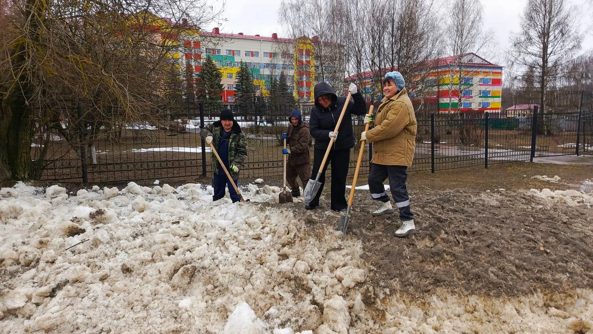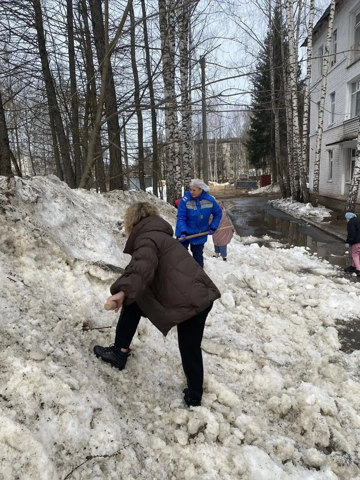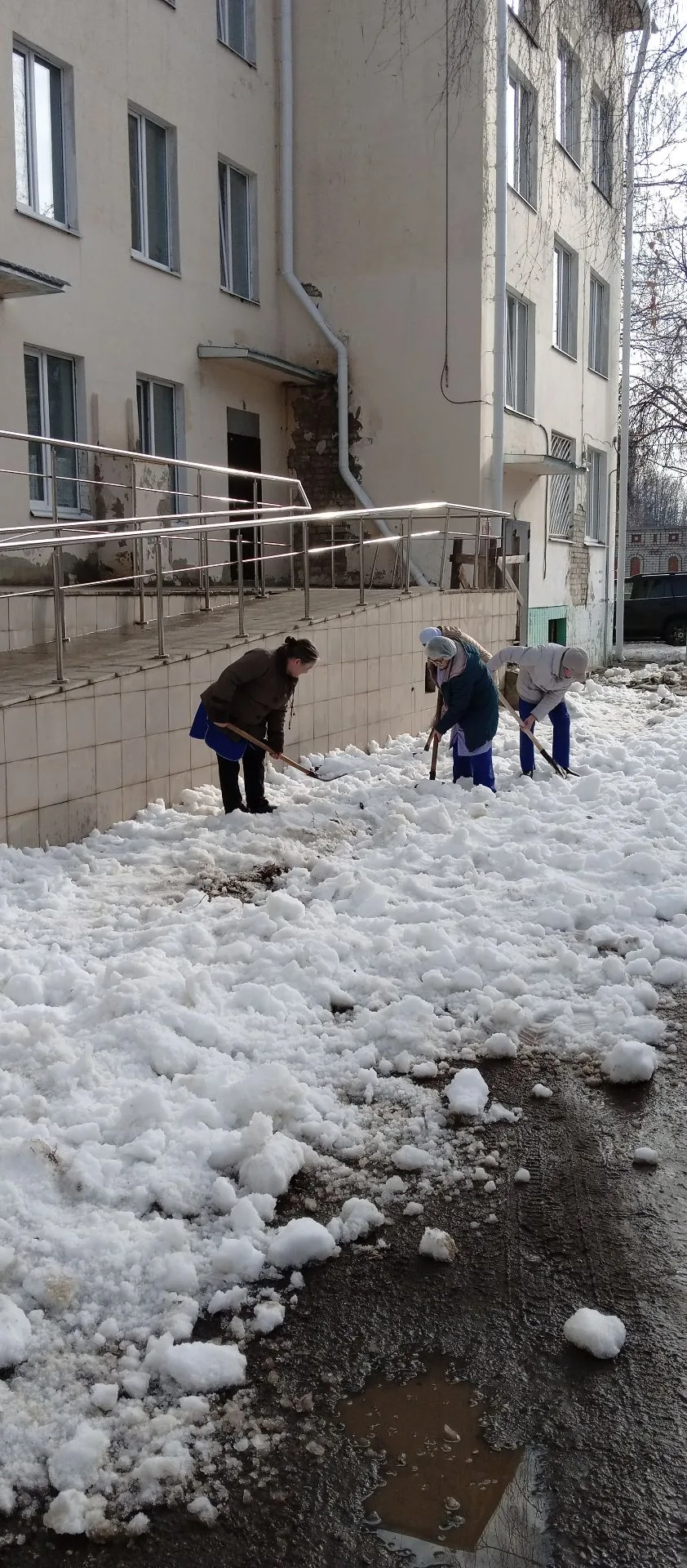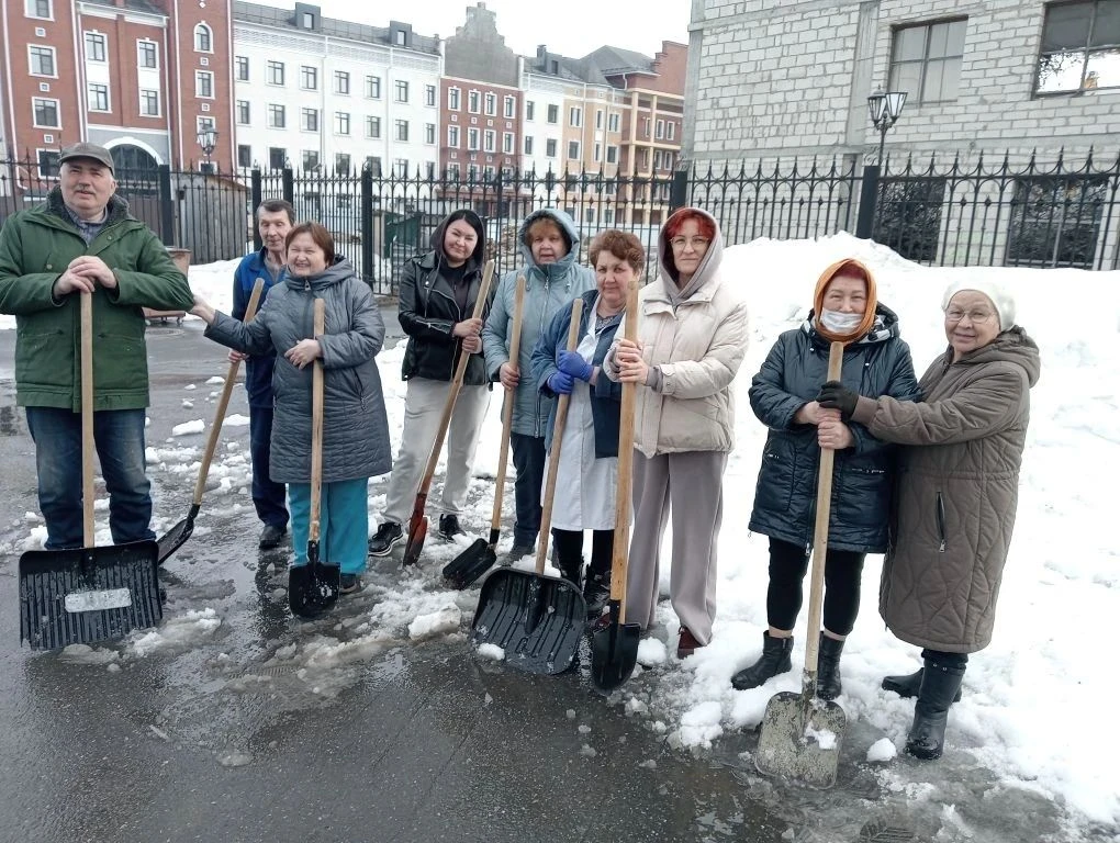 Медики рыхлили и разбрасывали снег, чтобы он быстрее таял, собирали вытаявший из-под снега мусор, приводили в порядок прилегающие территории.
