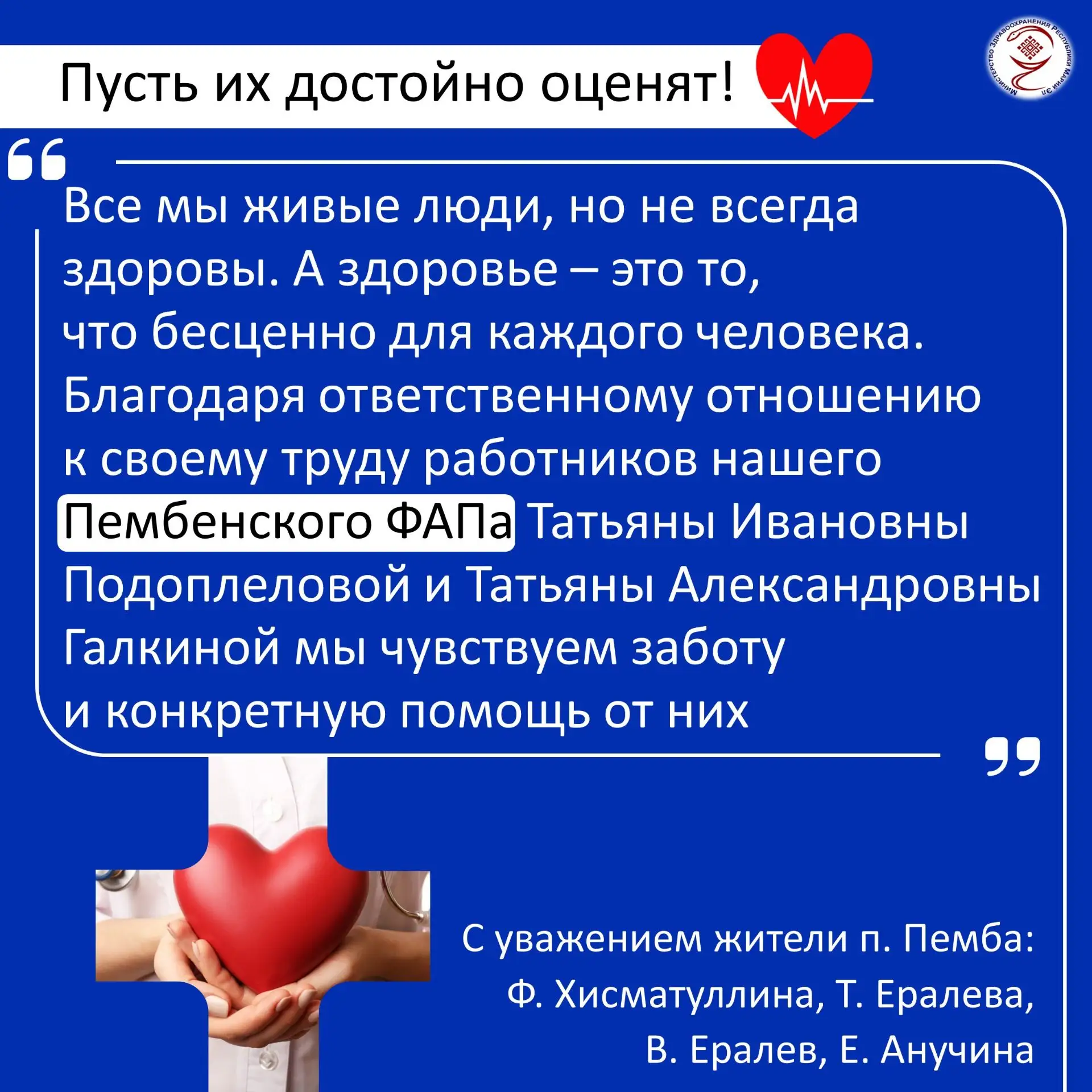 «Татьяна Ивановна Подоплелова – опытный специалист и ответственный руководитель, которая вовремя посетит больного на дому, окажет не только медицинскую помощь, но и поддержит больного в трудной жизненной ситуации.