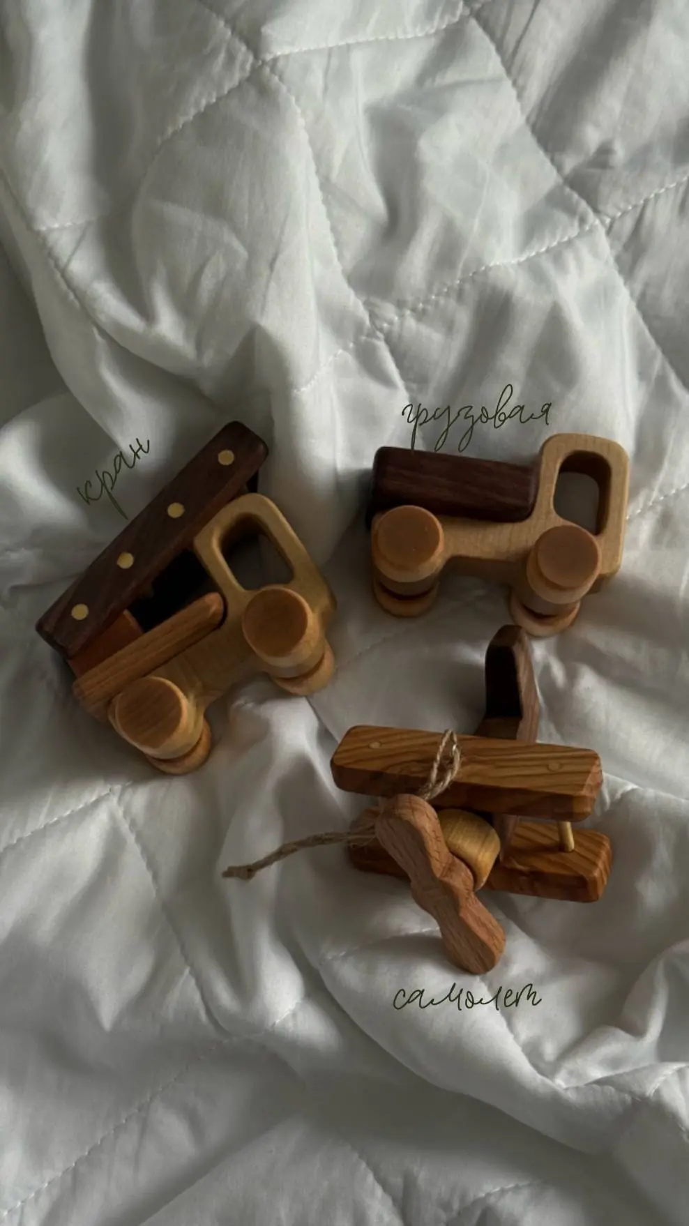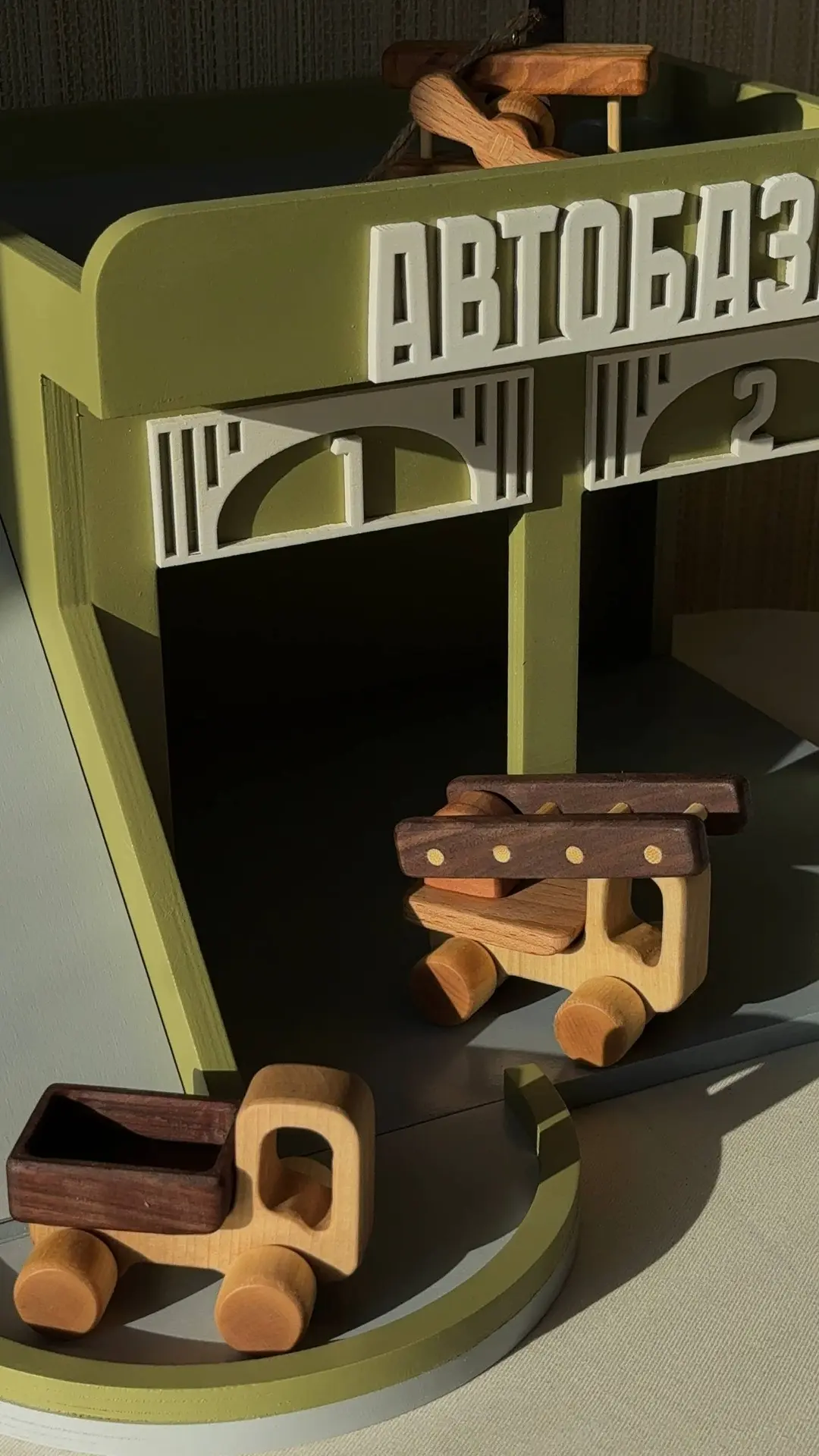 И вот недавно мы увидели фотографии — и поняли, насколько удачно всё получилось! Наши деревянные авто прекрасно разместились на элегантной деревянной площадке, превратившись в целостную, привлекательную игру.