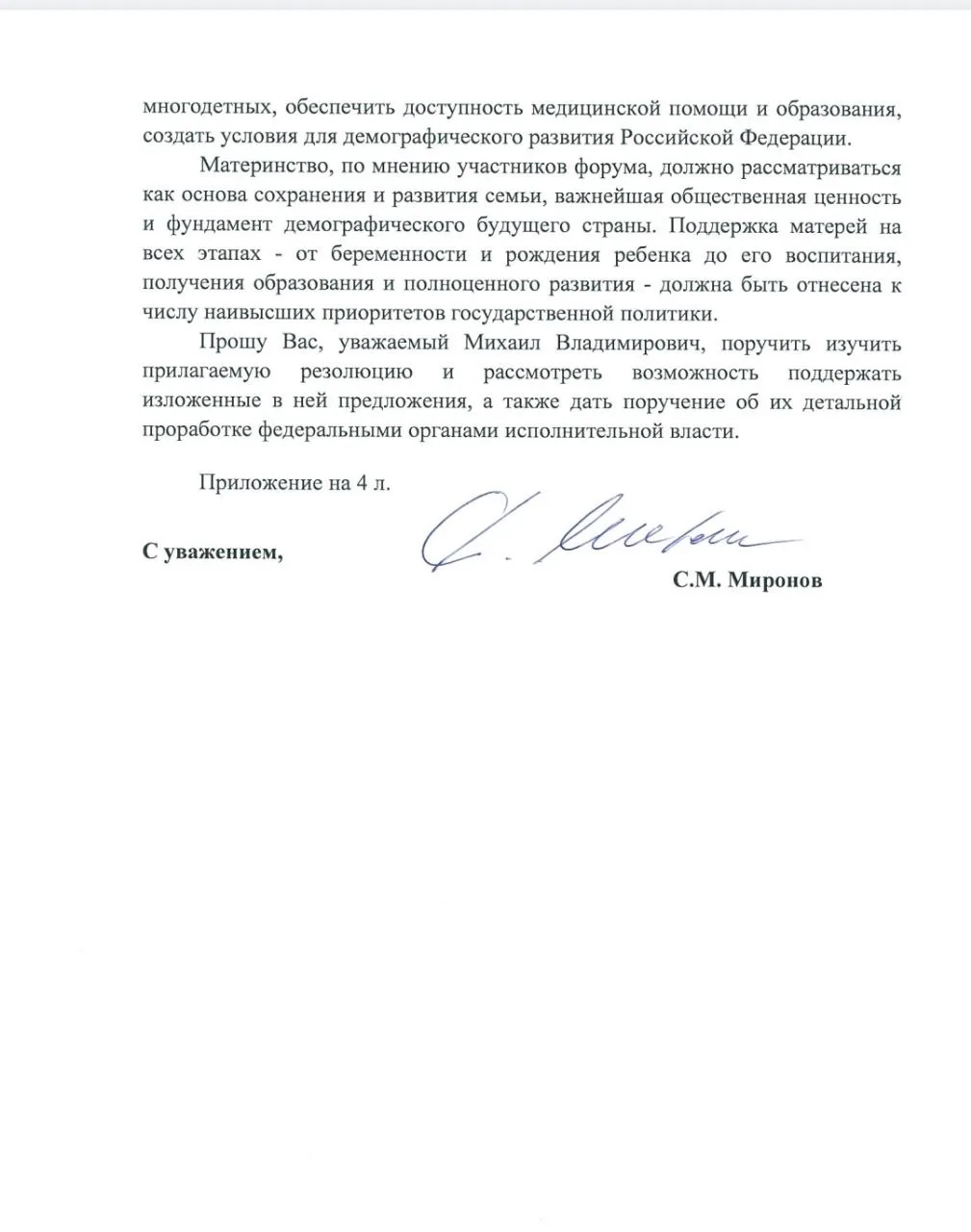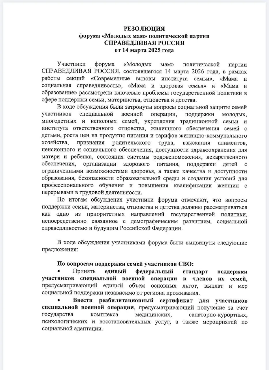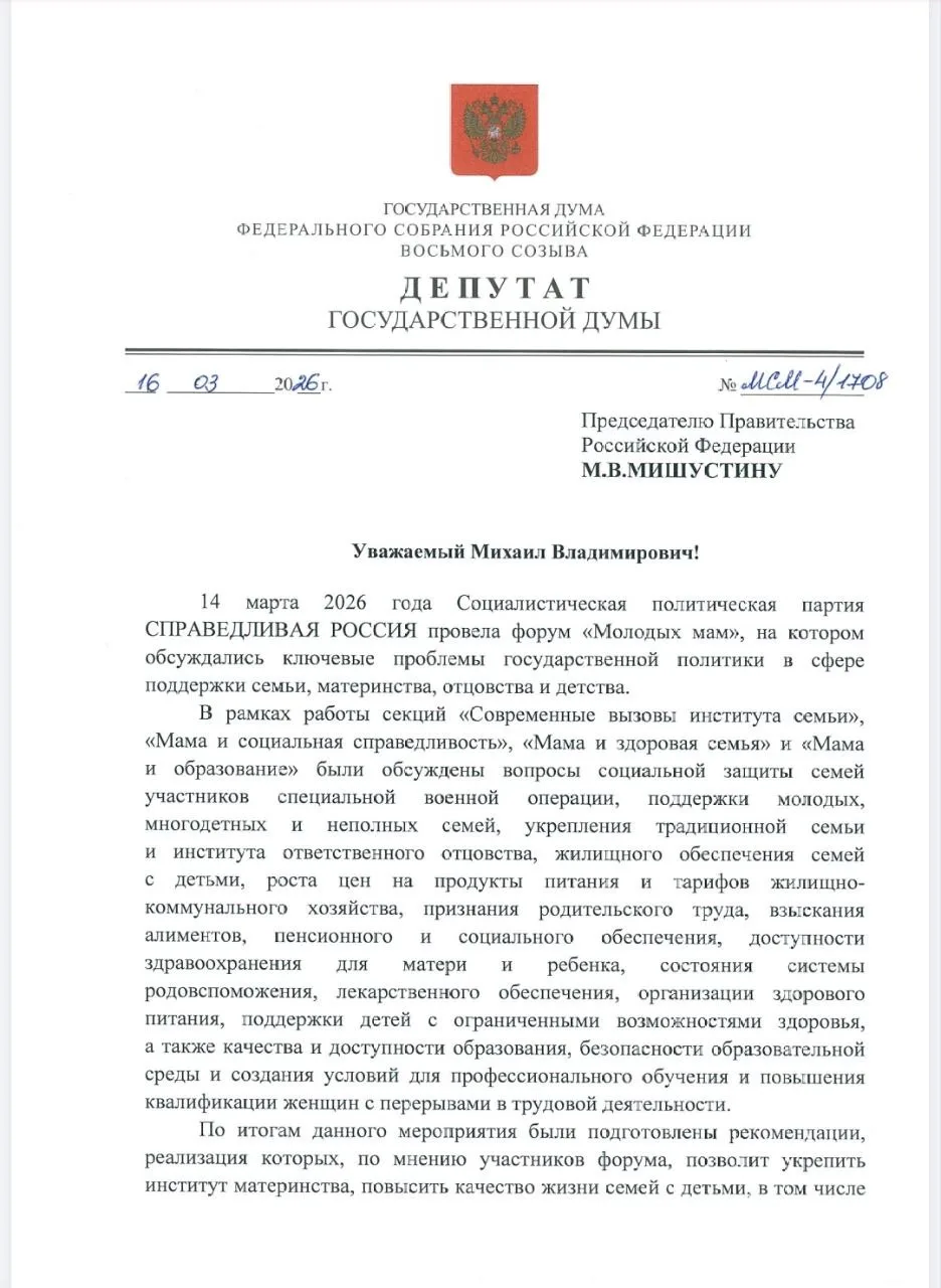 Направил главе правительства Михаилу Мишустину резолюцию нашего Всероссийского форума молодых мам. В ней почти полсотни демографических предложений «Справедливой России» и участников форума. Это инициативы по усилению поддержки семей участников СВО и многодетных семей. По доступности образования и медицины, что также важно для демографии. По решению жилищного вопроса и повышению пособий для семей с детьми.