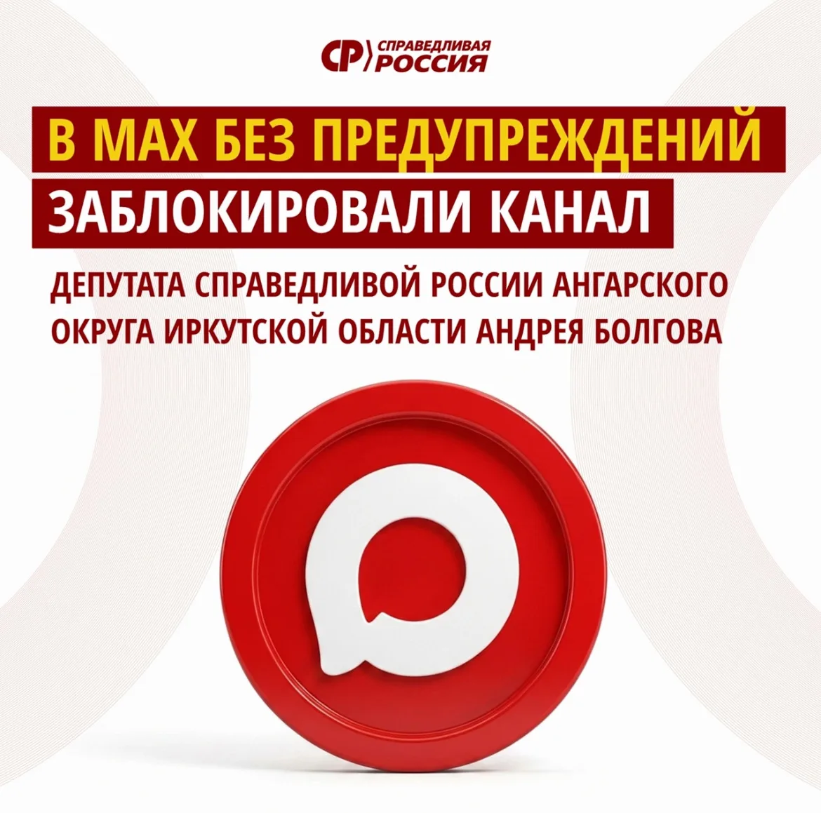 Канал в МАХ депутата СПРАВЕДЛИВОЙ РОССИИ Ангарского округа Иркутской области Андрея Болгова заблокировали без предупреждений.